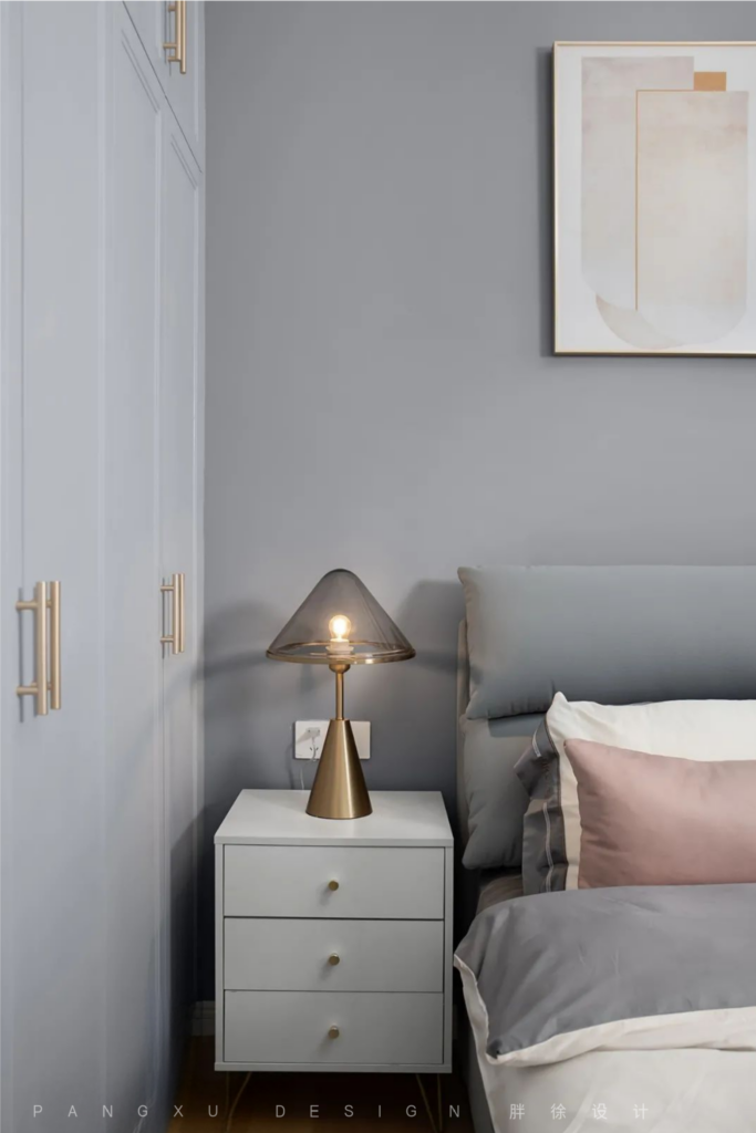 The master bedroom is dark gray and dirty pink. Use Bay window to set up makeup area, you can put sundries, also do a beautiful girl. The striking curved dirty pink window shape was drawn by the designer herself.