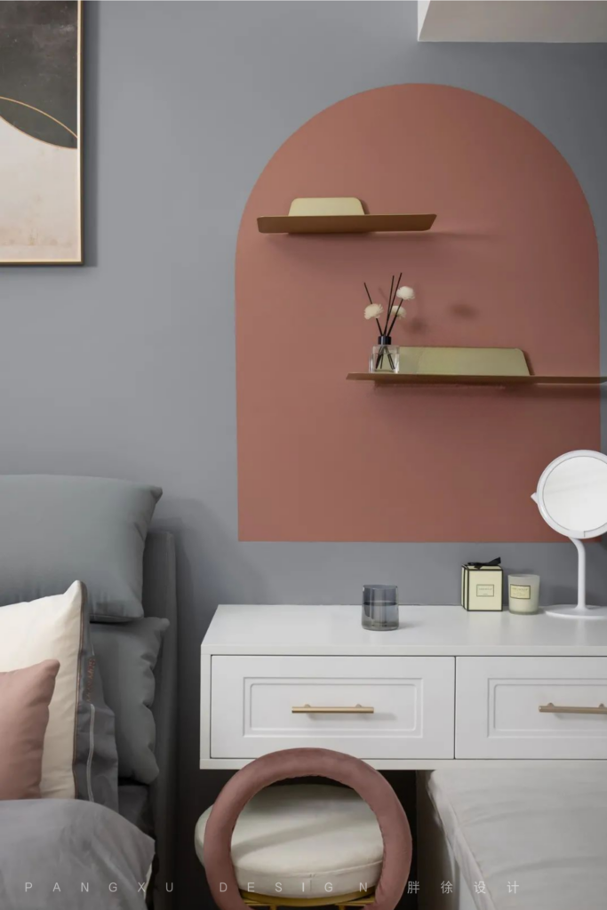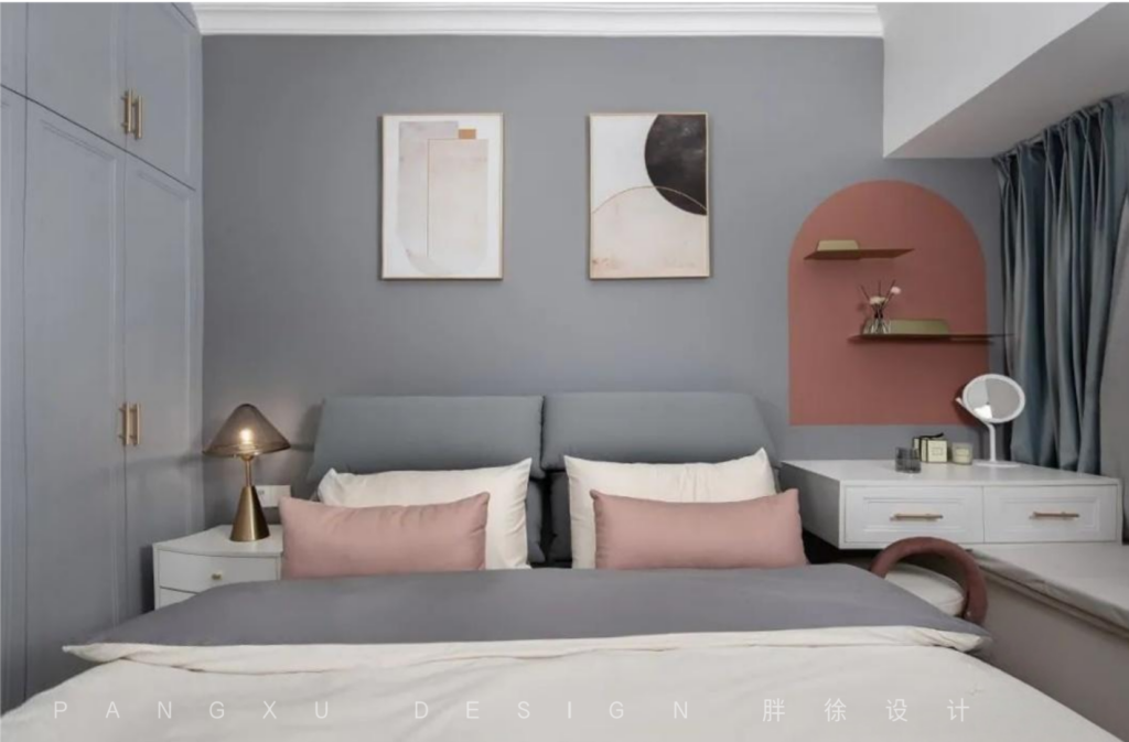 @胖徐设计工作室:主卧深灰+脏脏粉,不聒噪。利用飘窗设置了小化妆区,搁置杂物与精致女孩两不误。点睛的圆弧脏粉小窗形状,出自于设计师的灵魂之手。