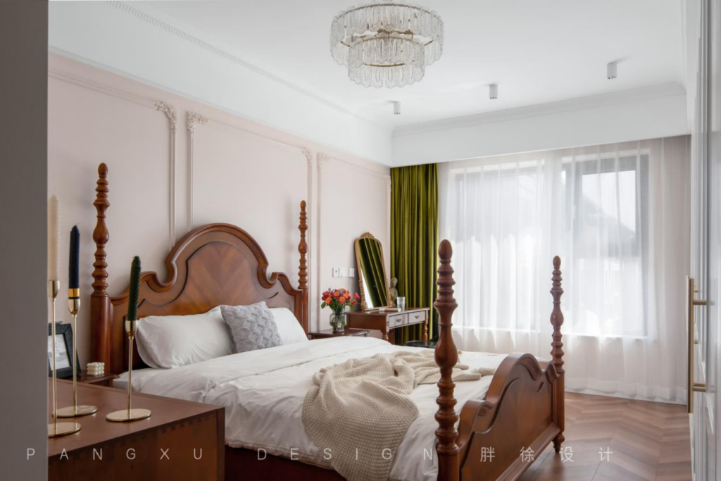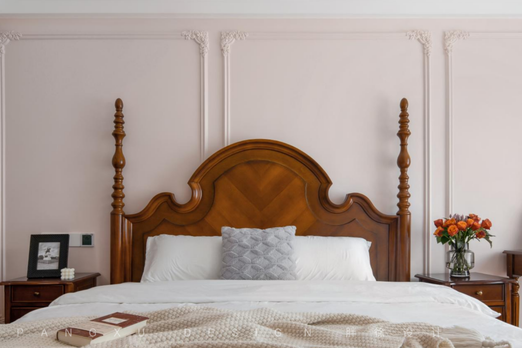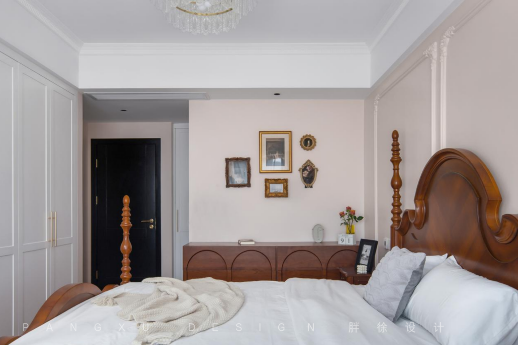 The simple and exquisite French plaster line was the curve flow in the master bedroom, quietly showing elegance. The dark brown retro furniture brought a classical and charming atmosphere, filling the entire space with American retro and French elegance.