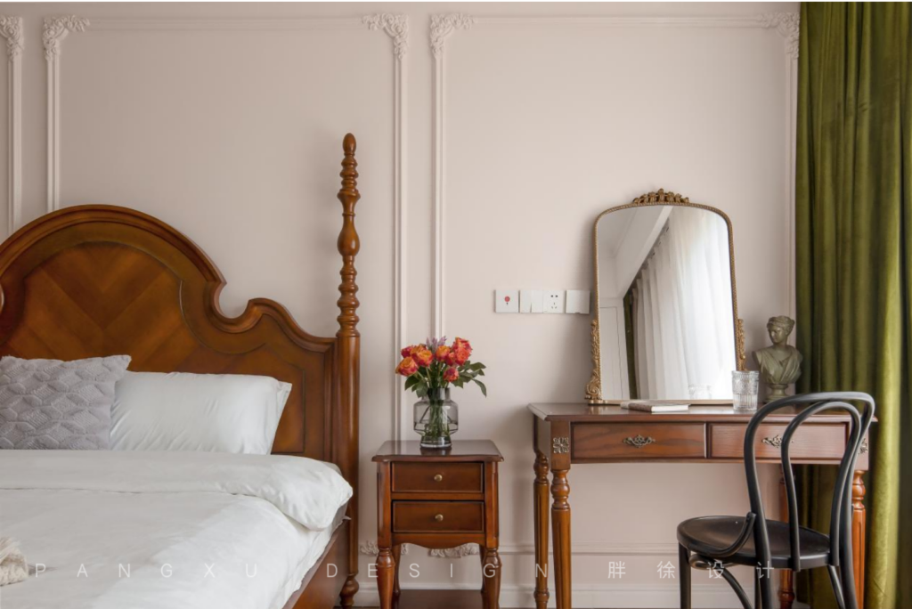 @胖徐设计工作室:简约而不失精致感的法式石膏线是主卧里的曲线流动,静谧地展示着优雅,深棕色复古的家具带来经典而又不失韵味的氛围感,用美式的复古与法式的优雅填满整个空间。