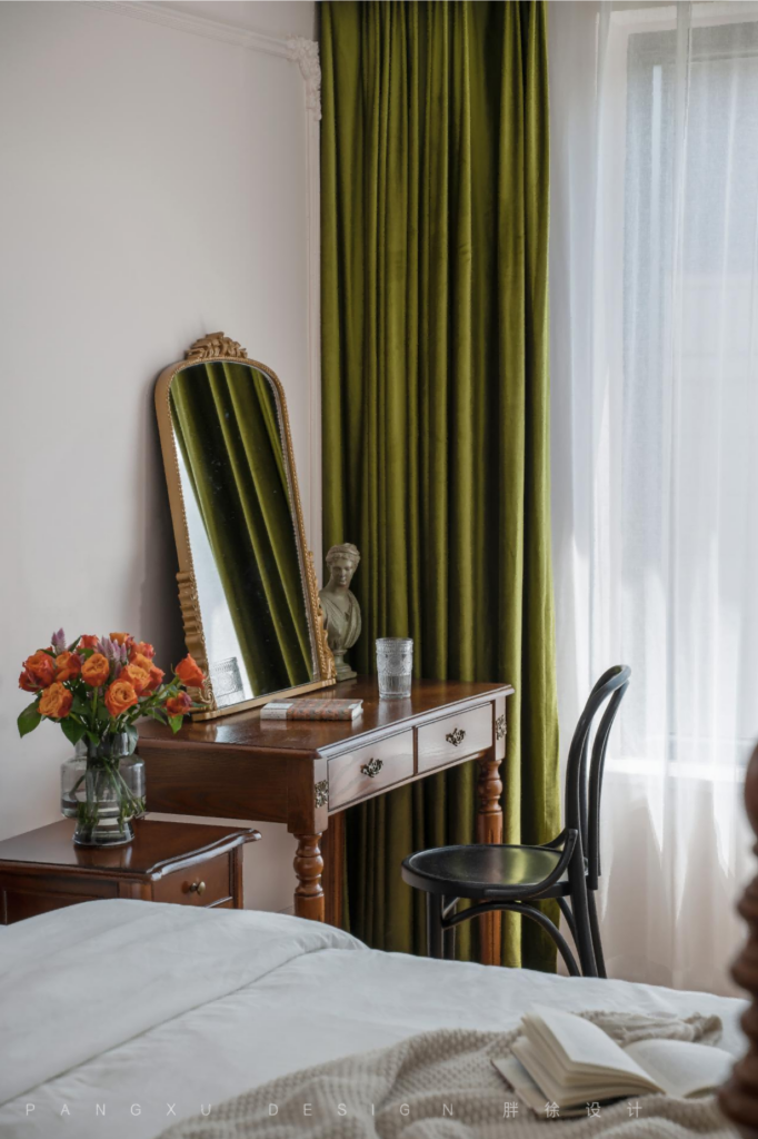 @胖徐设计工作室:一面铜金梳妆镜,倒映着复古绿的绒布质感,火红的玫瑰是这里最热情的色彩释放,每一处都是不失细节的小浪漫。