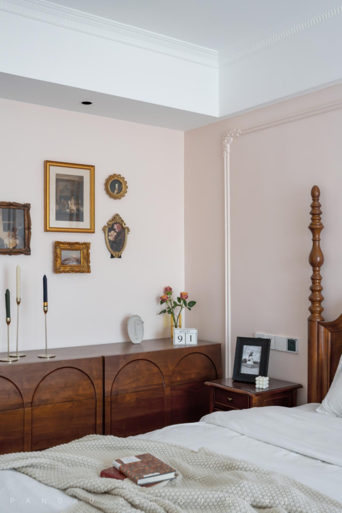 @胖徐设计工作室:复古的墙饰给单调的墙面带来生动的变化,位于一侧的同色系边柜,填补了此处浪漫的空缺。