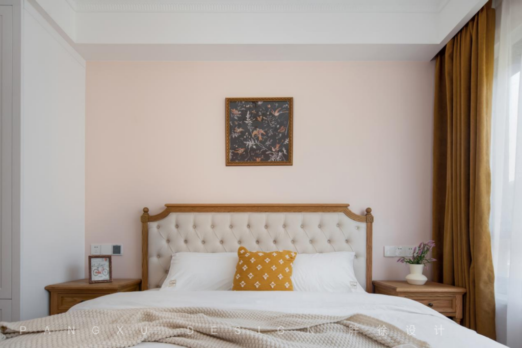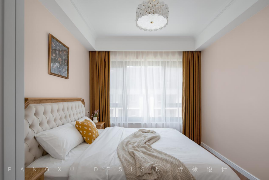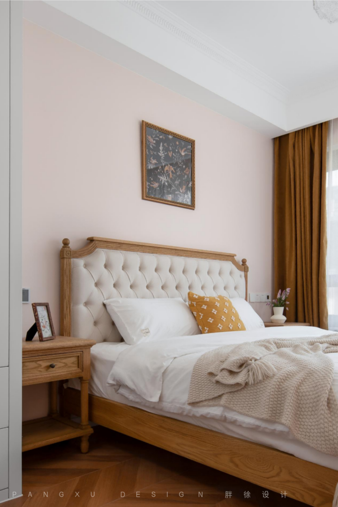 @胖徐设计工作室:次卧的色彩不多,却温馨得刚好,暖棕色是沉溺于温柔的表现,来一点法式的细节点缀,就在此刻沉醉。