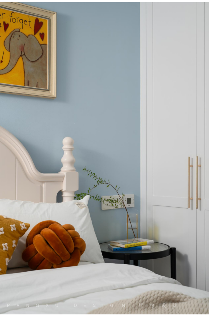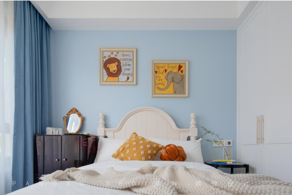 @胖徐设计工作室:用充满童趣的卡通挂画来装饰儿童房,静谧的天空蓝,天真无邪,是独属于小朋友的童真港湾。