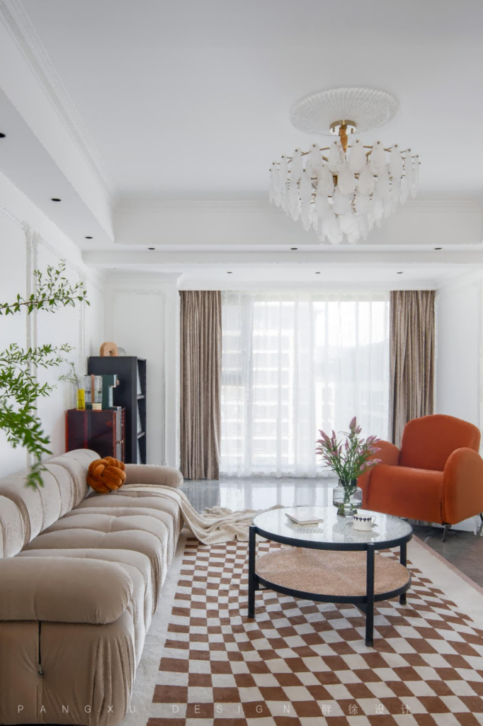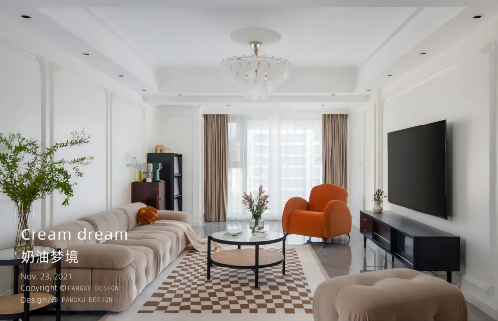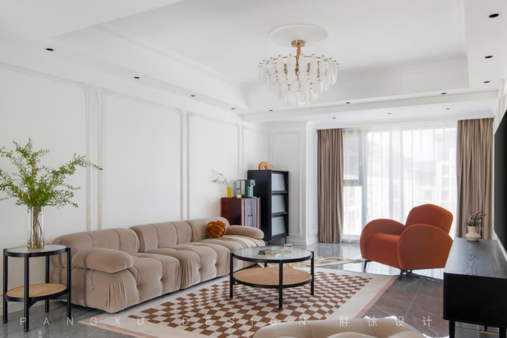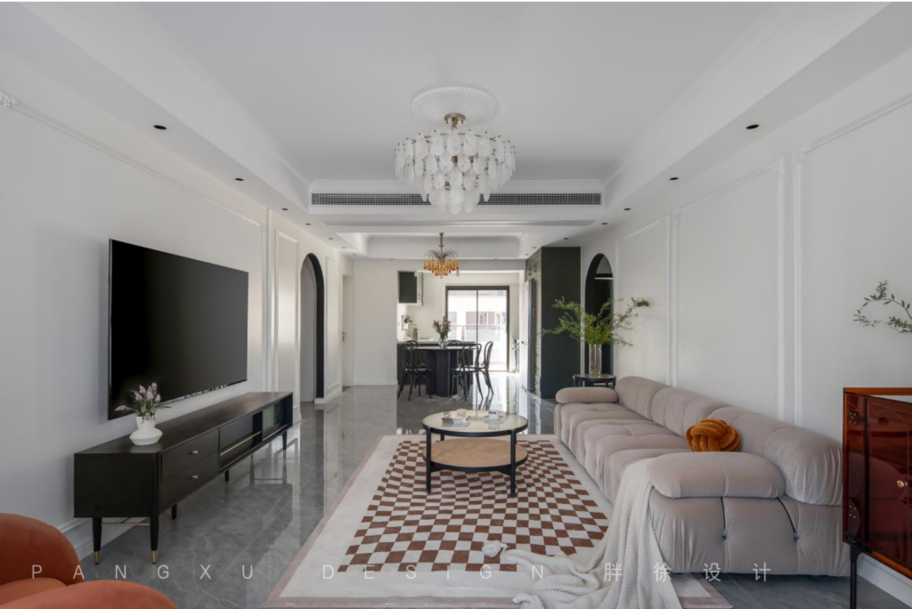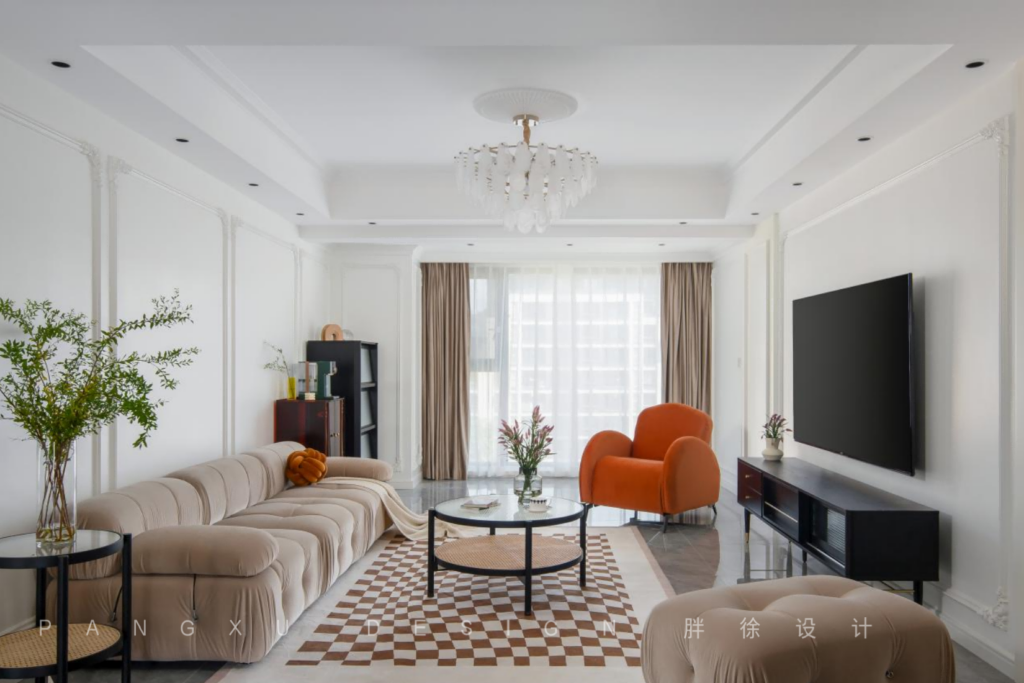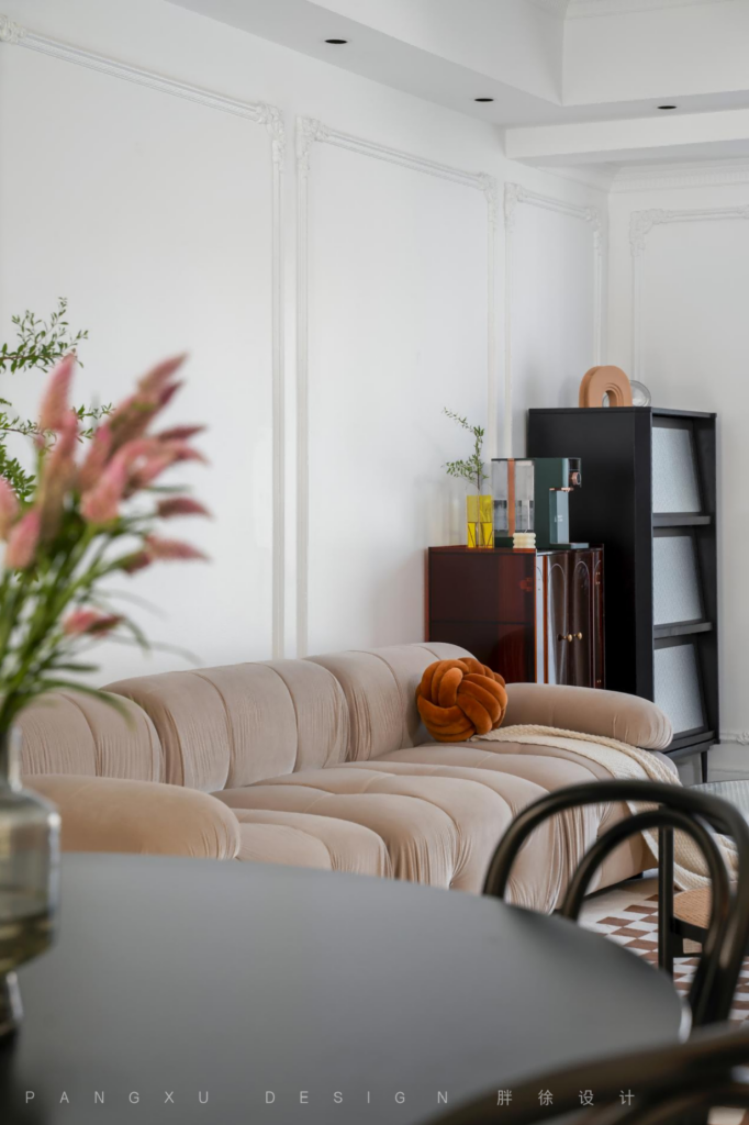 @胖徐设计工作室:法式的优雅,融入奶咖的细腻温柔,少不了石膏线条勾勒的精致,这样绝美的搭配,是弥漫于整个客厅的氛围。