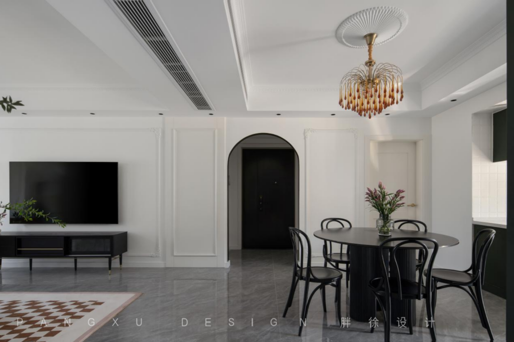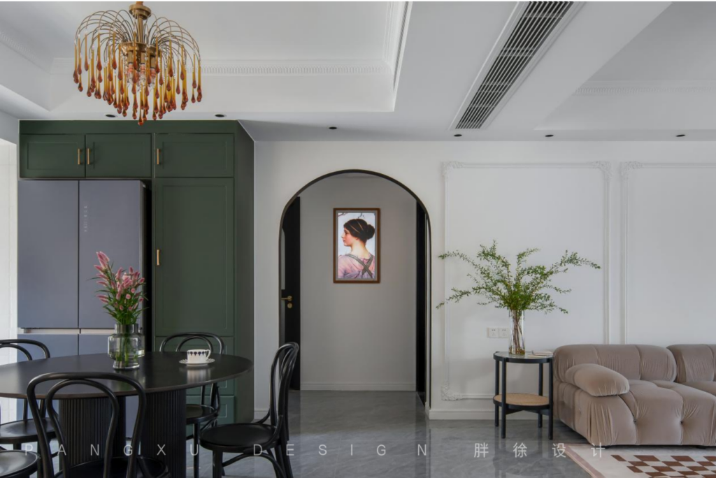 The retro French chandelier was an elegant and romantic note. There were pure black tables and chairs in an arc, and a dark green meal cabinet on the side. It was harmonious and lively in the   dining room, with the peace and tranquility hidden behind the arch.