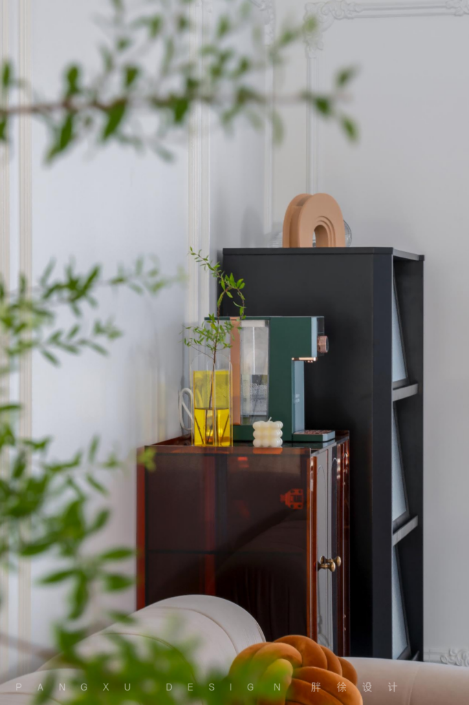 @胖徐设计工作室:能想象到的惬意,是柔软沙发和毛绒地毯带来的轻快放松,沙发一旁的半透边柜,简约时尚,也能带来更方便的使用体验感。