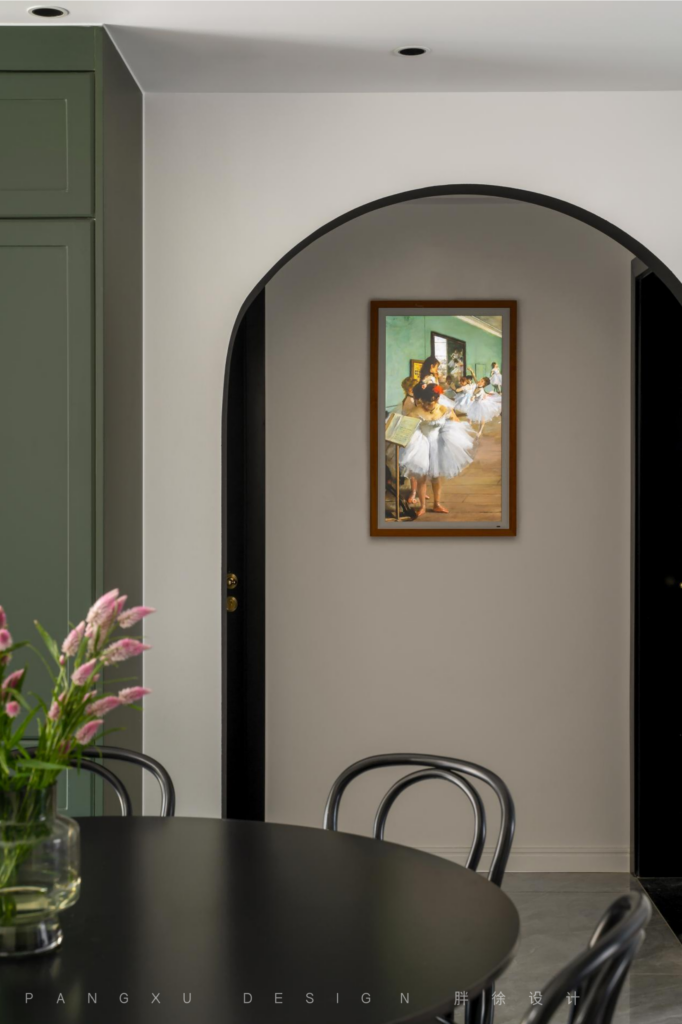 @胖徐设计工作室:复古的法式吊灯,是优雅浪漫的注解。有弧线的纯黑桌椅,一侧的墨绿餐边柜,与匿藏于拱门后的平和宁静,是位于餐厅一处的和谐生动。