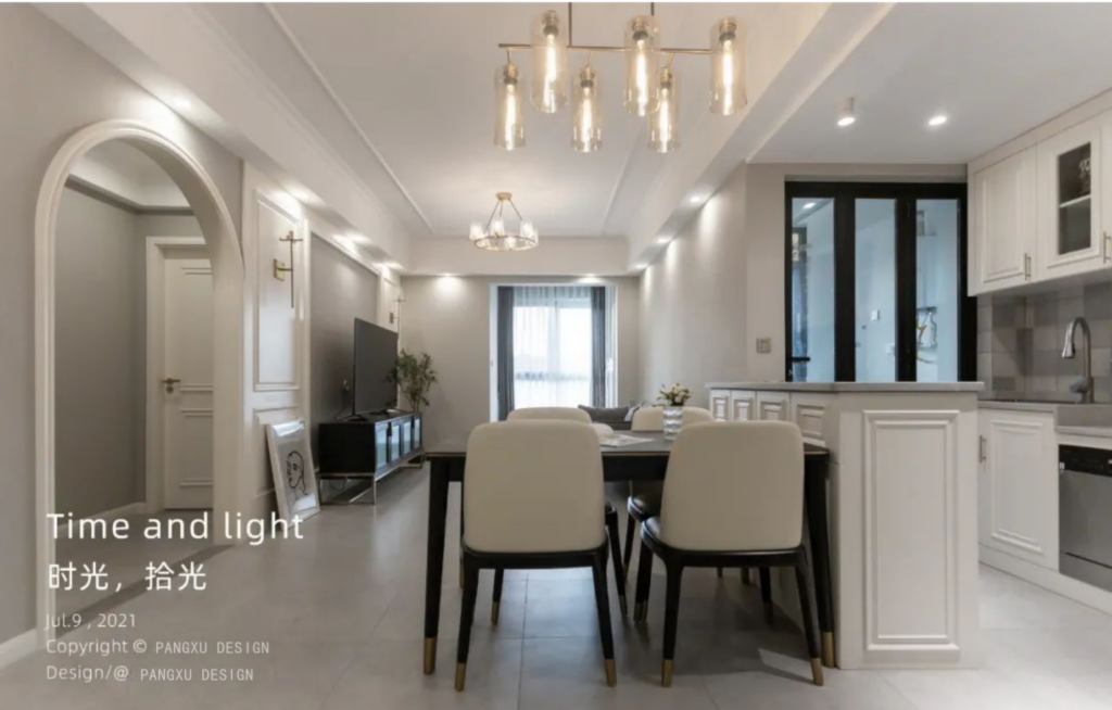The dining table and island platform meet the cooking needs of Chinese food and Western food. Through the arc door opening, it is a warm and quiet harbor, moving, static, complementary and harmonious.