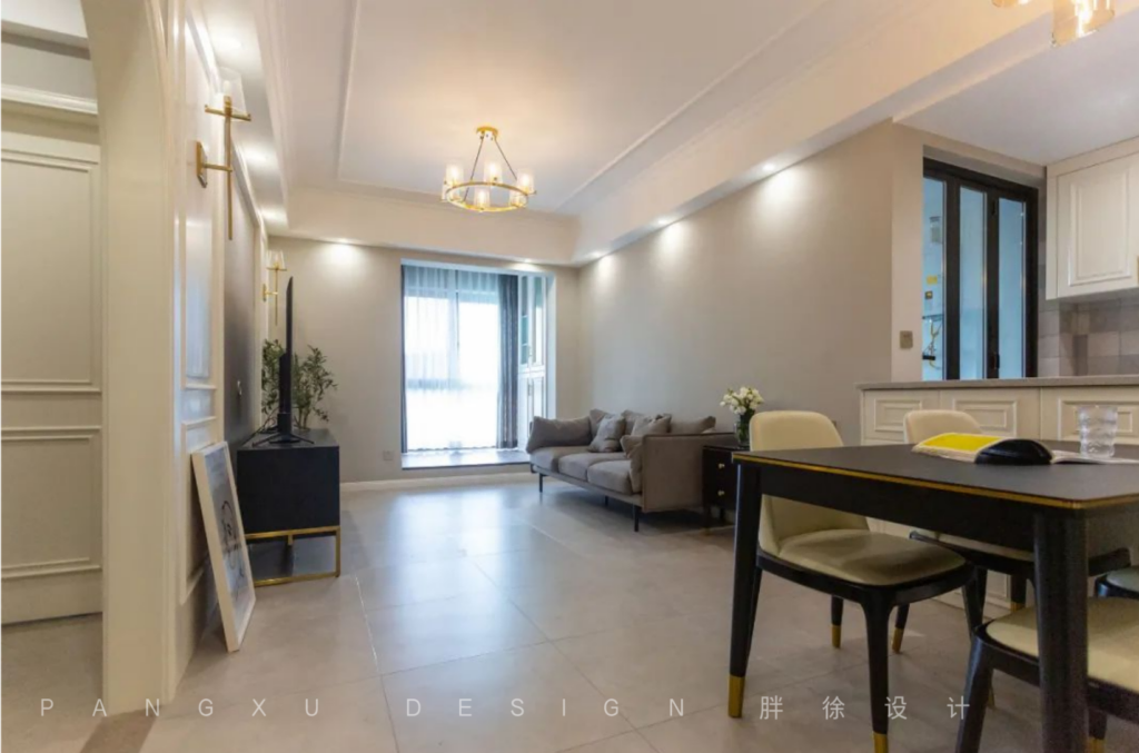 The living room is the main activity area of a home. Instead of the tea table, more interactive space is added. The metal corners outlined by the pure black TV cabinet are clean and tidy. Here to meet guests, here to relax, record the most simple and happy moment of life.
