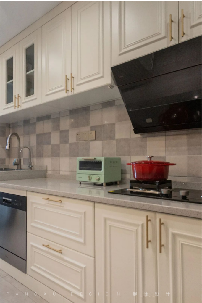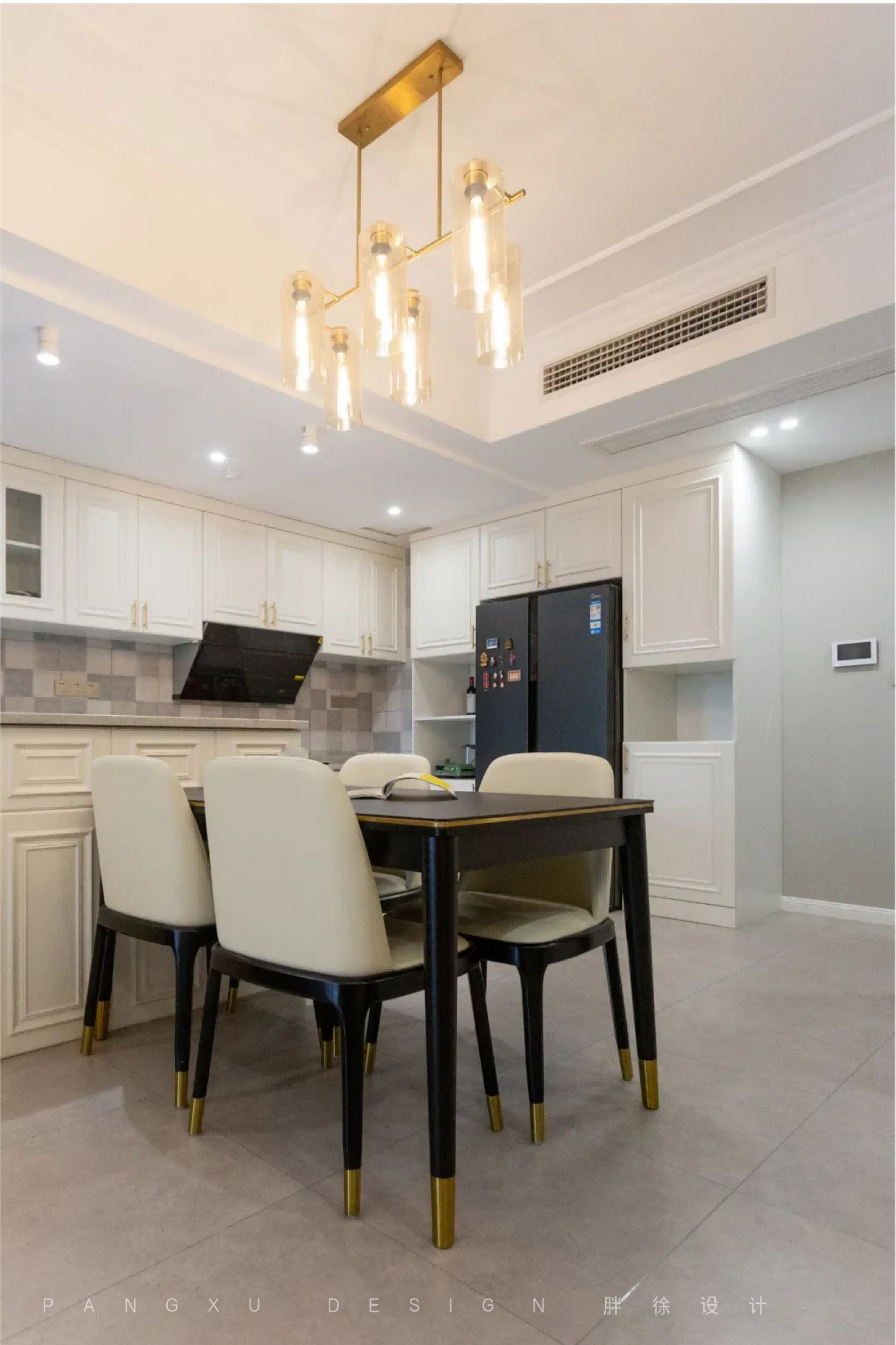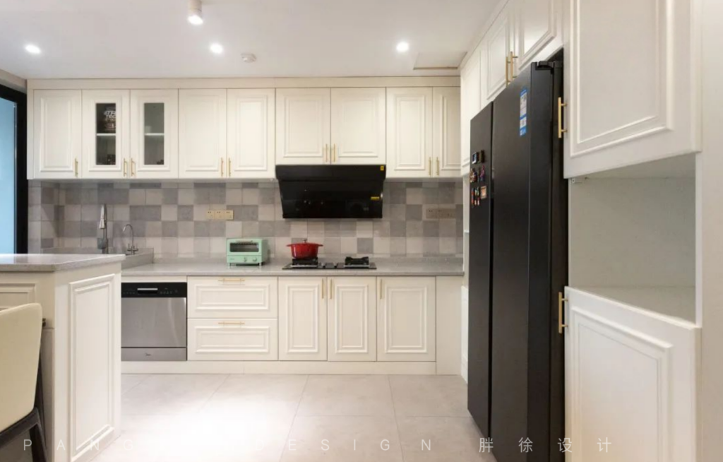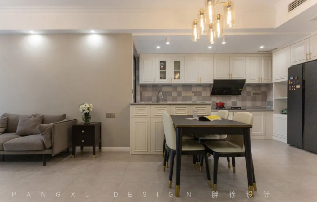 @胖徐设计工作室:开放式厨房,米白的橱柜搭配内嵌的纯黑冰箱,是一场色彩的极致碰撞,厨房的整个动线直接流畅。一家人在此烹饪,将瓜果蔬菜变成美味佳肴的过程也是如此幸福。
