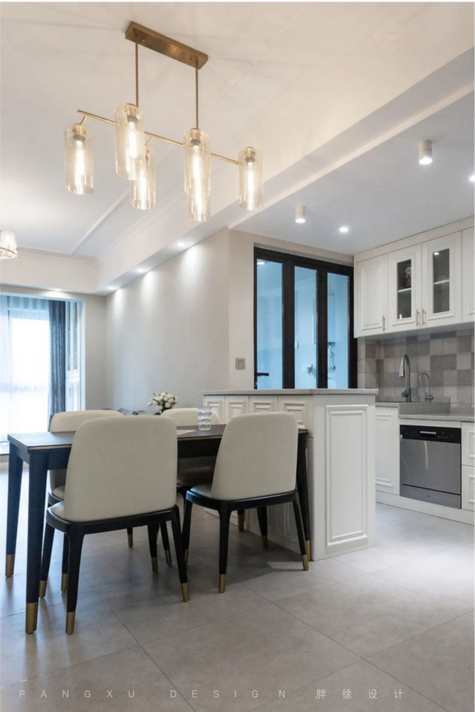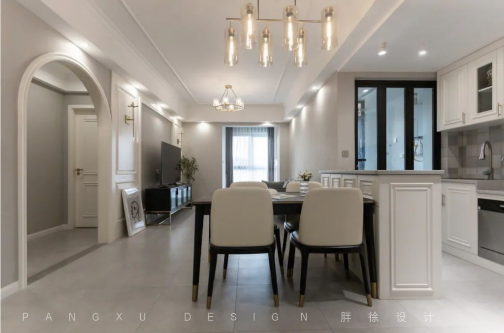 @胖徐设计工作室:餐桌加岛台,满足中餐西餐的烹饪需求,穿过弧形门洞就是温馨静谧的休憩港湾,一边动,一边静,相辅相成,和谐融洽。