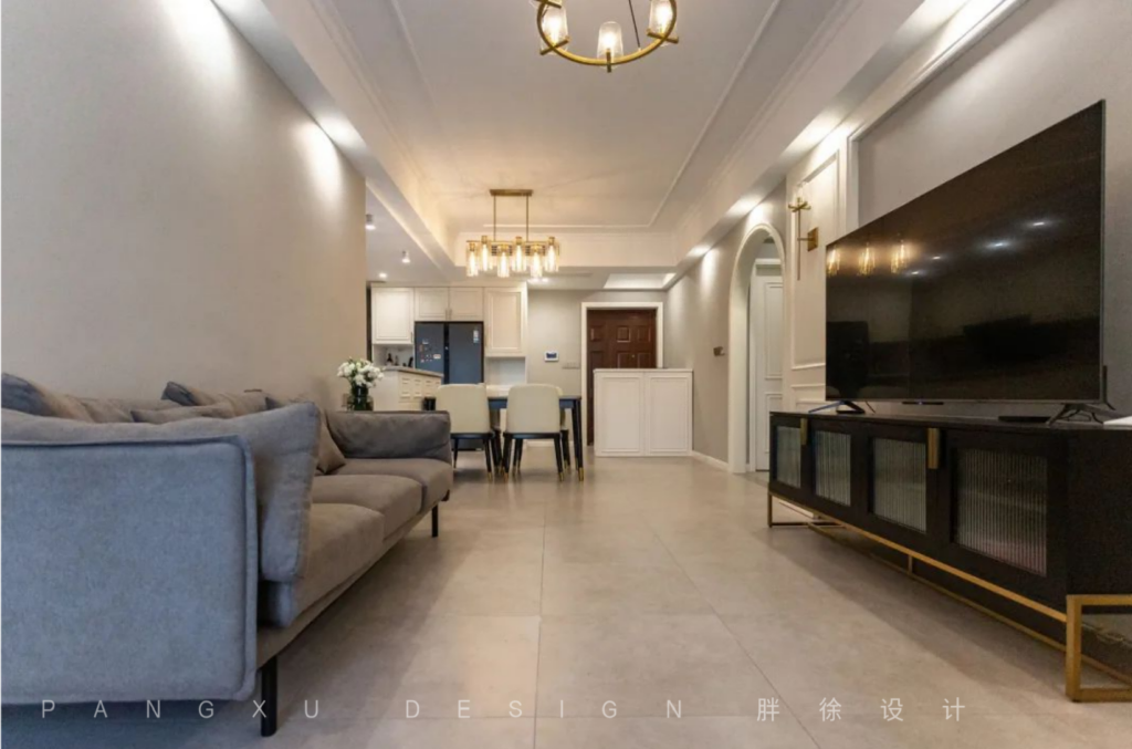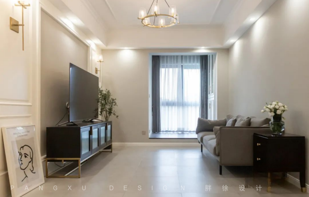 @胖徐设计工作室:客厅是一个家的主要活动区域,舍弃茶几,增加更多的互动空间,纯黑电视柜勾勒的金属边角,干净利落。于此会客,于此休闲,记录下生活最简单快乐的瞬间。