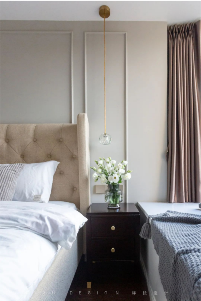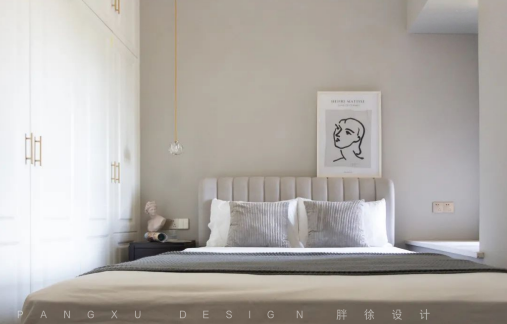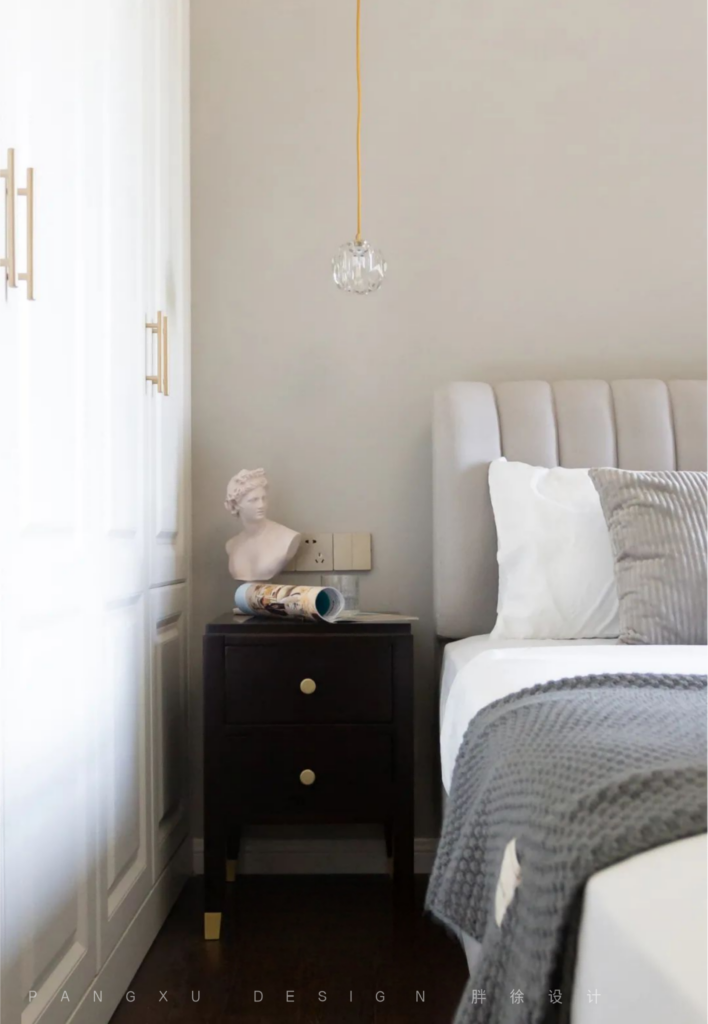 @胖徐设计工作室:次卧素雅,浅色系铺陈底色,干净细腻,一盏灯,守护入梦的夜晚。