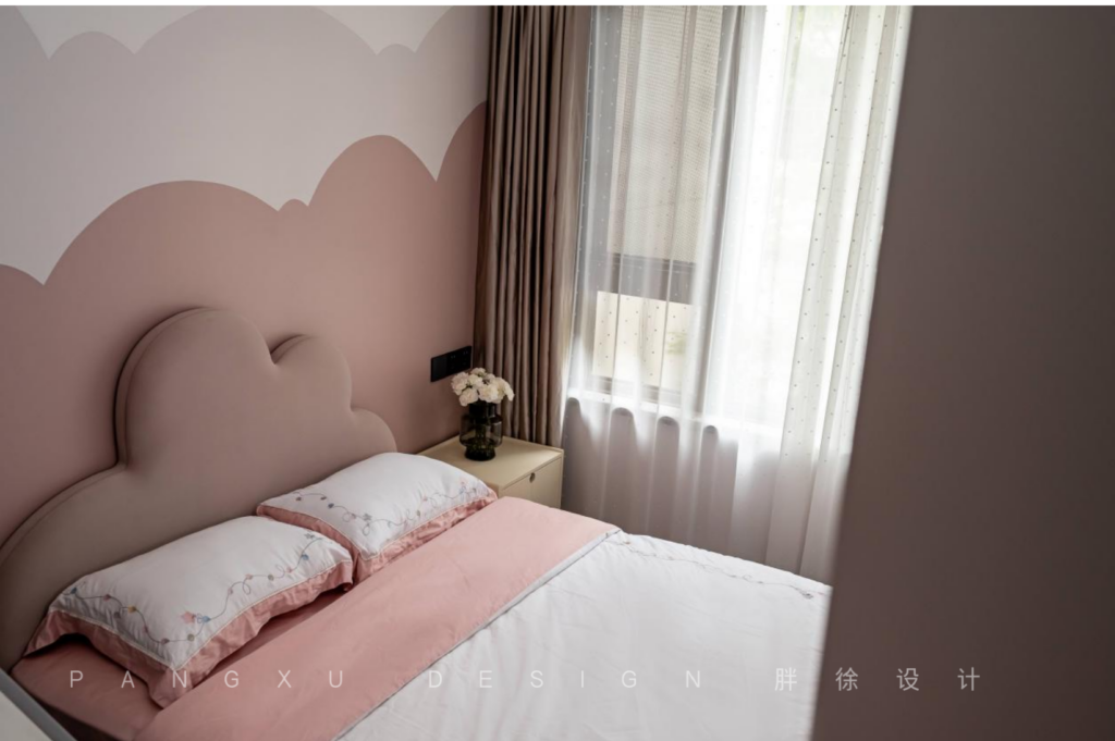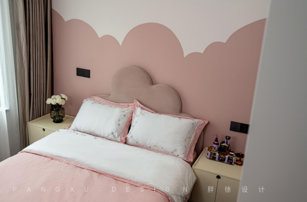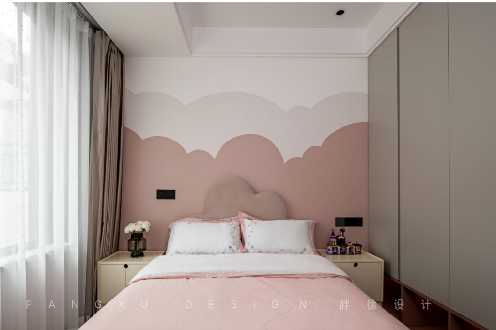 The daughter’s room was in the same pink and white color. The background wall had layers of clouds, which corresponded with the shape of the bed head. It was childish and lovely.