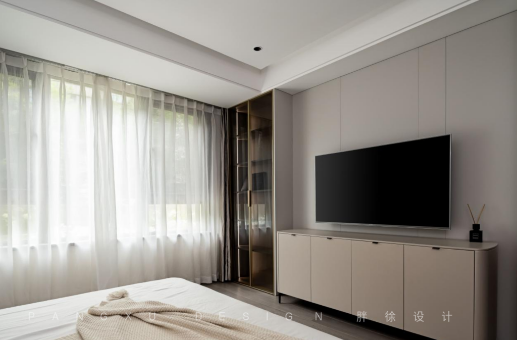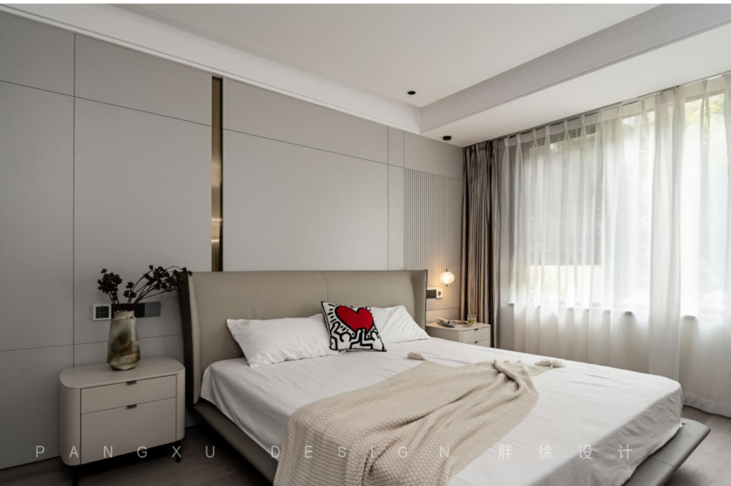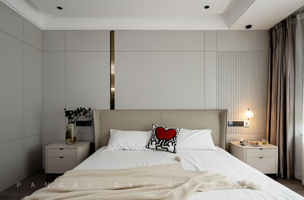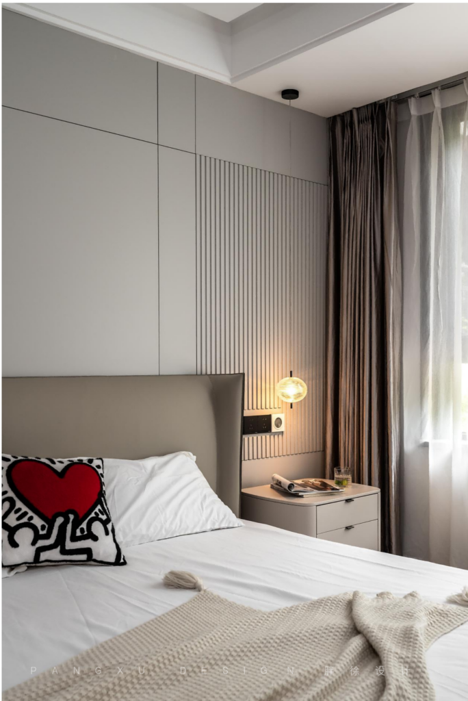 The master bedroom continued the extravagant feeling of the whole room. The grid wall of the ecological wood was high-grade, simple but not monotonous.