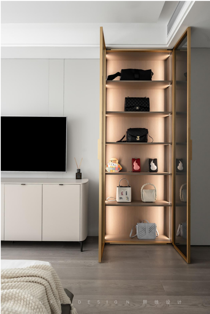 There was a top to ceiling display cabinet, which was enough for the daily accessories of the hostess. The transparent glass door was matched with the induction light belt, which was low-key, reserved and full of fashion.