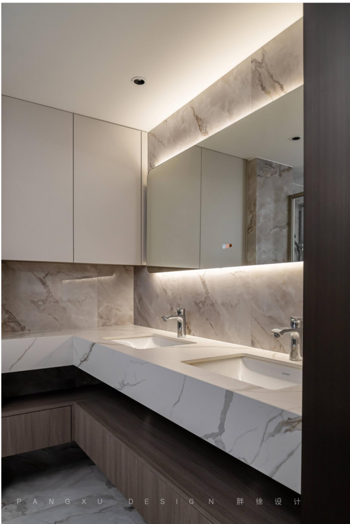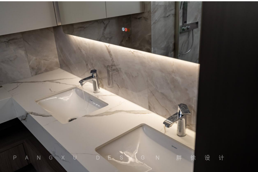 @胖徐设计工作室:主卫简洁明亮,双台盆设计,足够两人一起使用,互不影响。