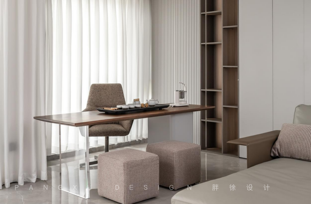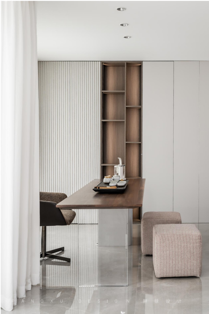 @胖徐设计工作室:开放式的茶室,干净素雅,避免过多色彩的加入,纯色更能带来平和而宁静的氛围感。