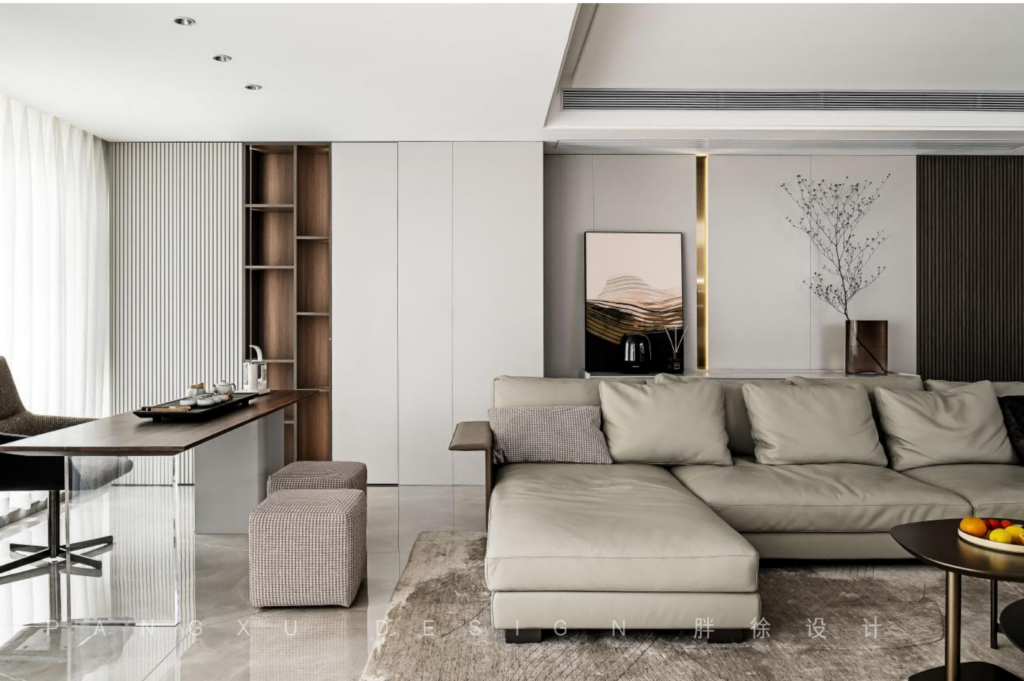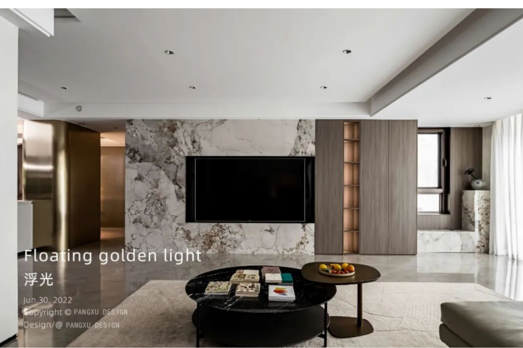 @胖徐设计工作室:入户所见即一整块潘多拉铺设的电视背景墙,沉稳大气,木饰面的加入又增添了一分温柔细腻感。