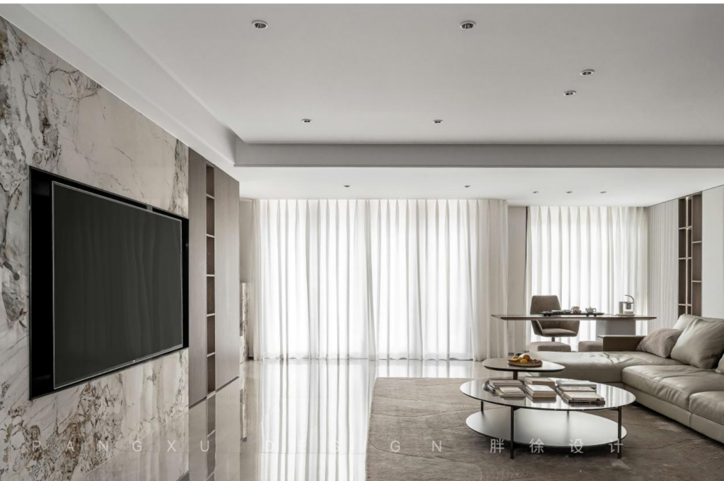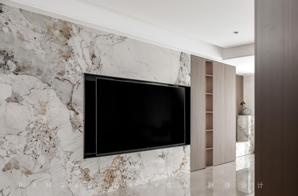 Into the door the TV background wall laid down in an entire marble texture, calmed in the atmosphere, and the addition of wood finishes add yet another gentle subtlety.