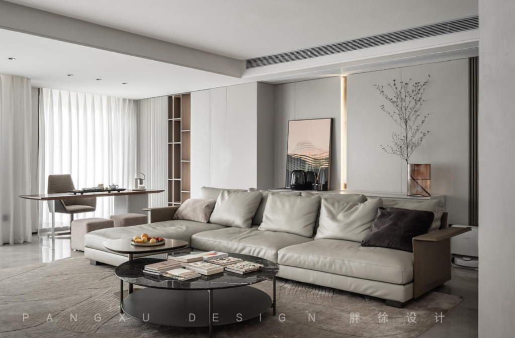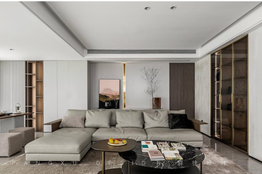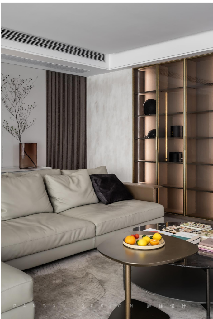 @胖徐设计工作室:格栅的背景墙契合于此的格调,一门到顶的展示柜,随感应灯光亮起而变得通透清亮,增加了整个客厅的轻盈感。