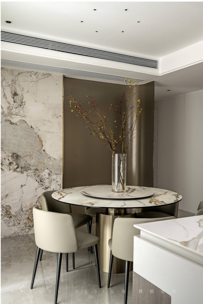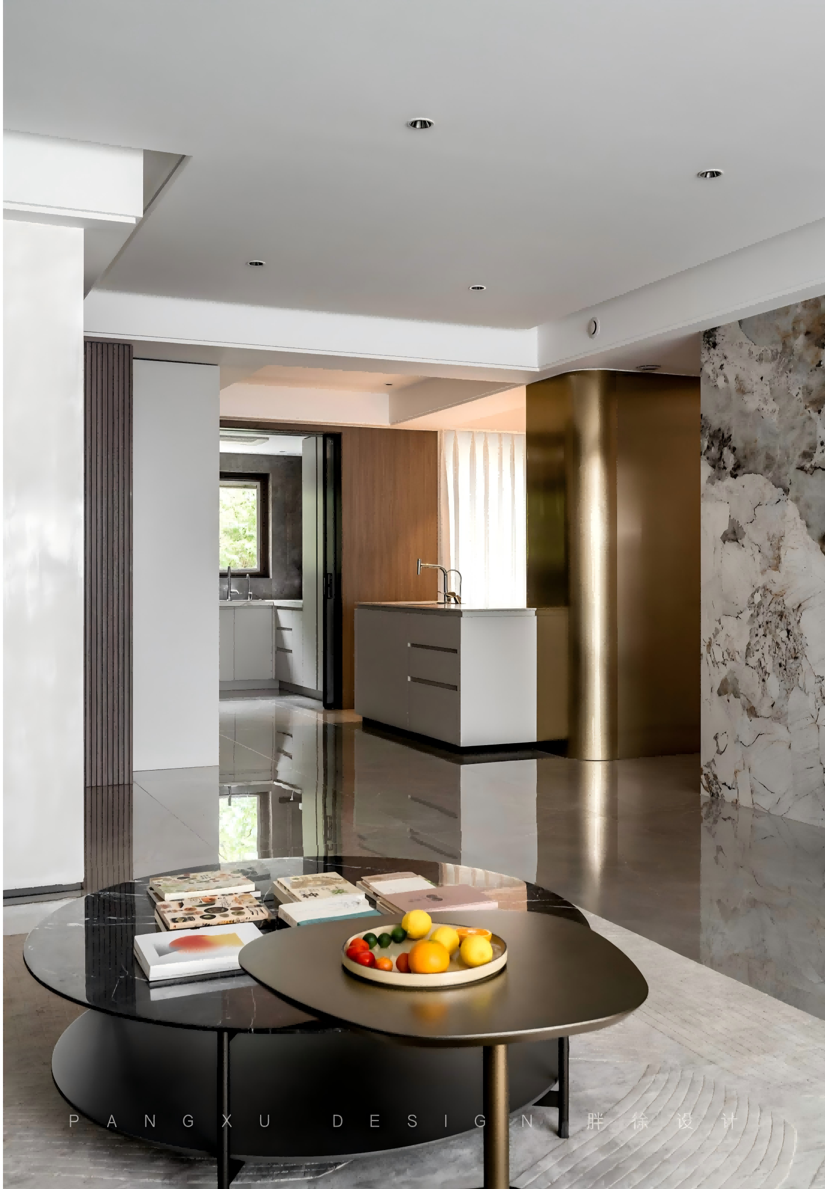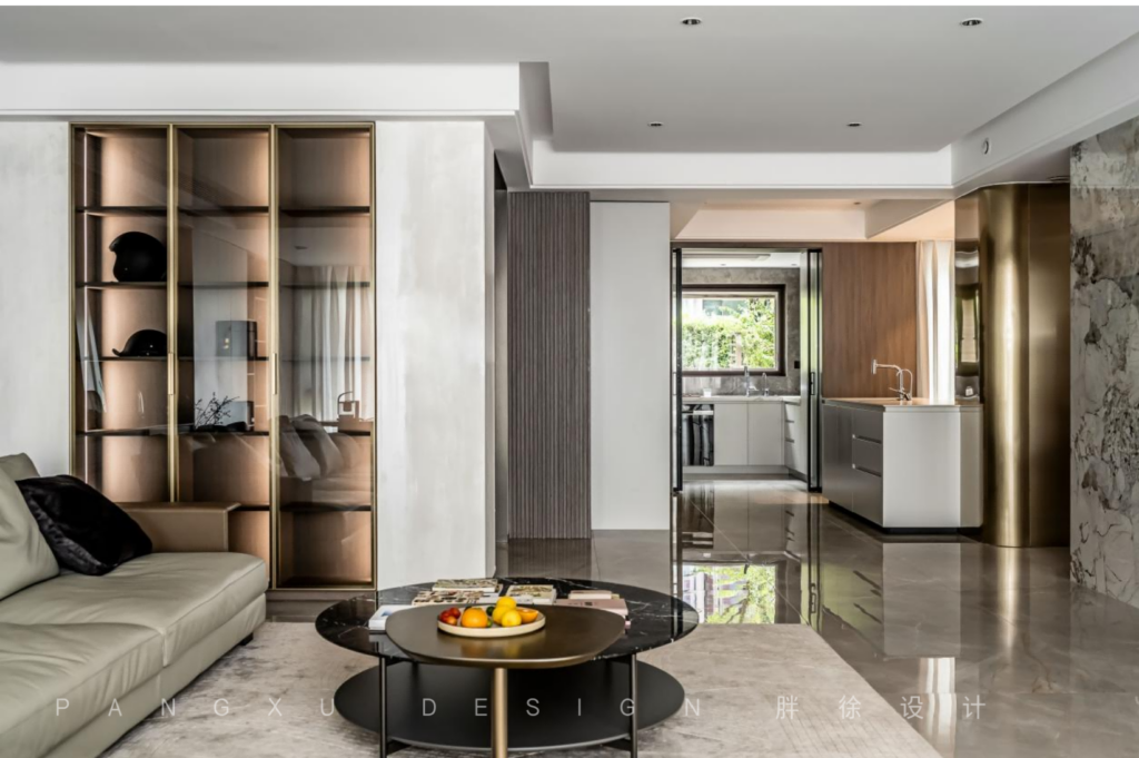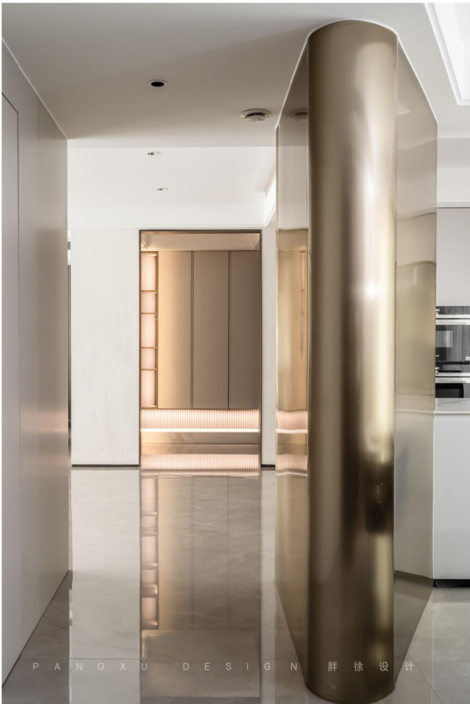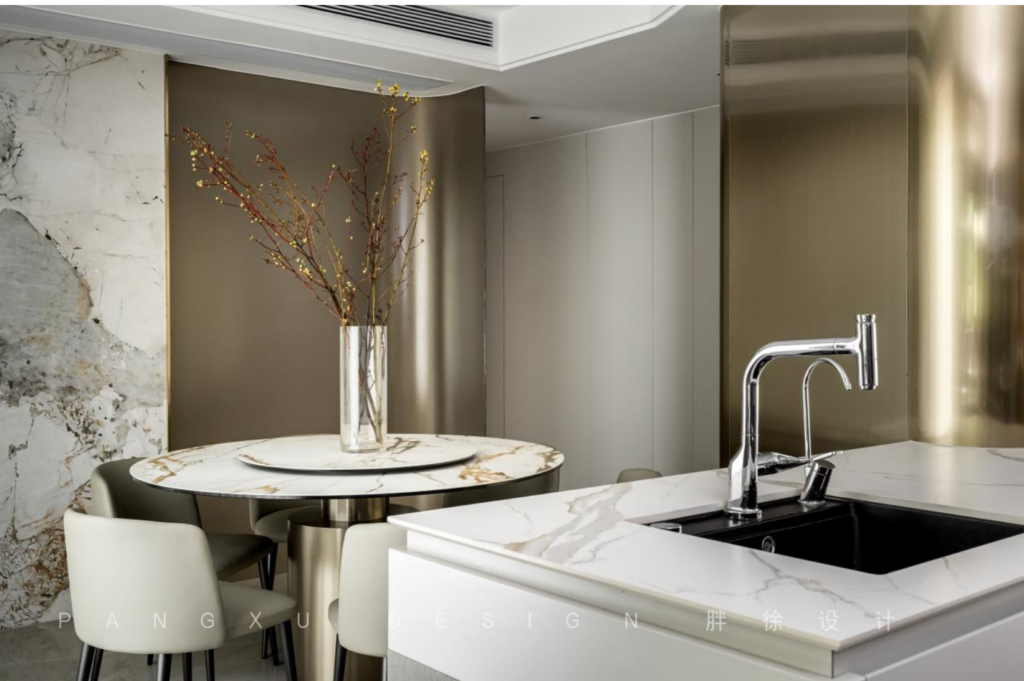 @胖徐设计工作室:经过走廊,一侧便是餐厨区域,具有金属感的弧形造型作为客厅起居与餐厨之间的分隔,既不影响区域之间的互通也能增加空间的通透感。
