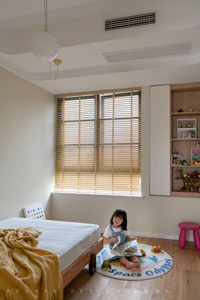 @胖徐设计工作室:靠墙而立的独立小床,留下更宽敞的儿童玩耍活动空间,开放的书柜,预留摆放玩具的空间,让儿童房更整洁有序,也能增添不少的童趣感。