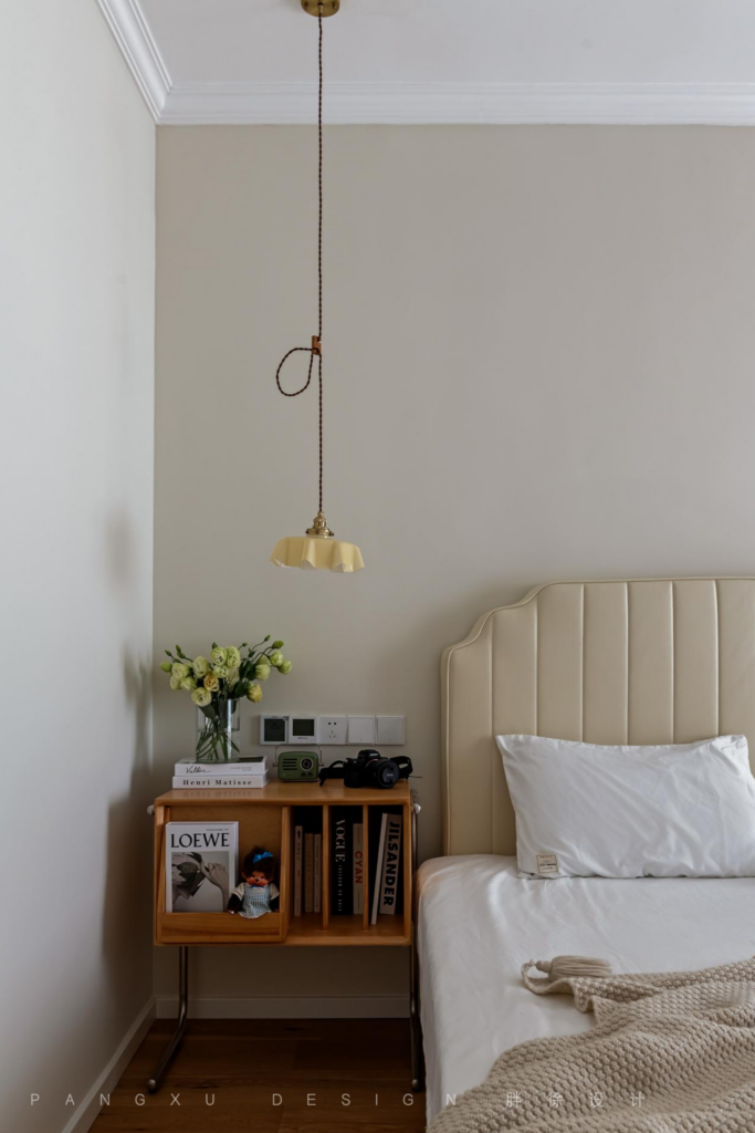 @胖徐设计工作室:主卧氛围静谧安稳,色彩浅淡素雅,用方便存放书籍的小书柜作为床头柜使用,保留屋主睡前阅读的小习惯。