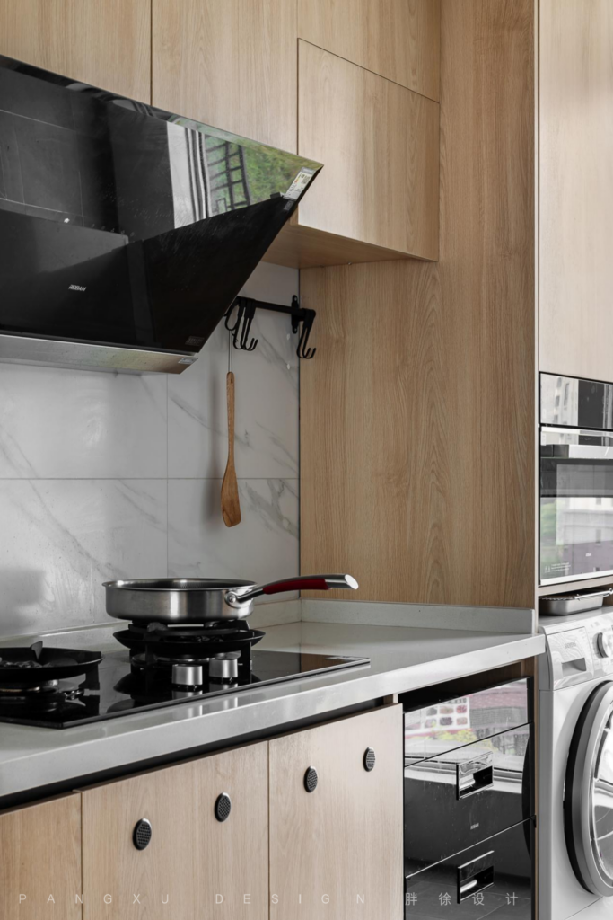The kitchen was simple and bright, and a suitable space was reserved. Some electric appliances were embedded in the cabinet, making the kitchen space more orderly.