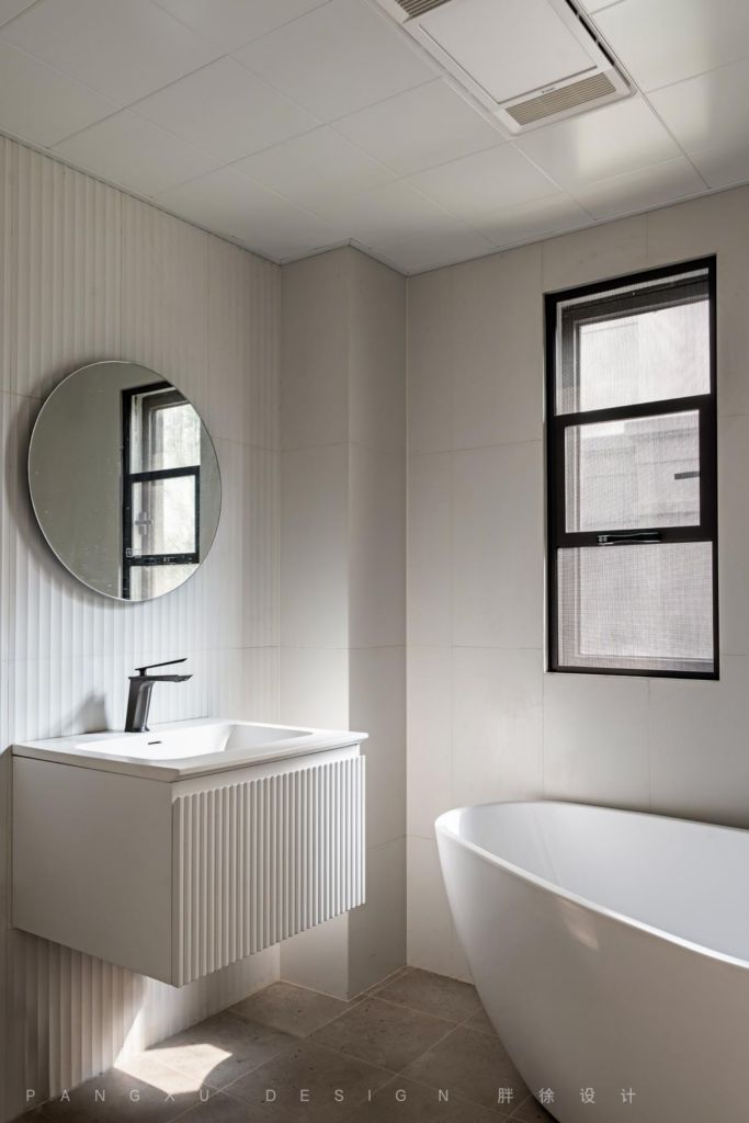 @胖徐设计工作室:卫生间没有过多的色彩,纯净的白能让整个空间更干净透亮,用简单的格栅造型来填补纯色的单调感。