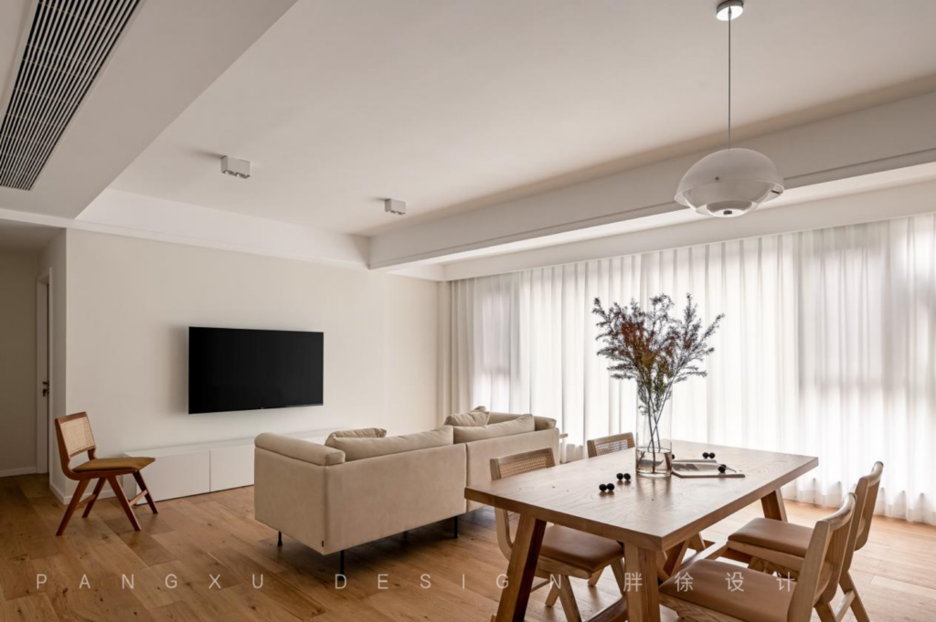 The overall tone of the living room is uniform, and the large area of white space makes the whole space look cleaner and brighter. The wood relaxes and comforts, giving a proper effect here, warm and plain.