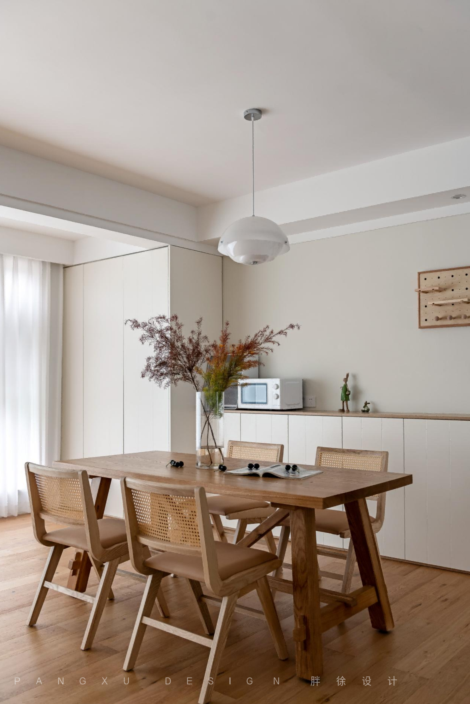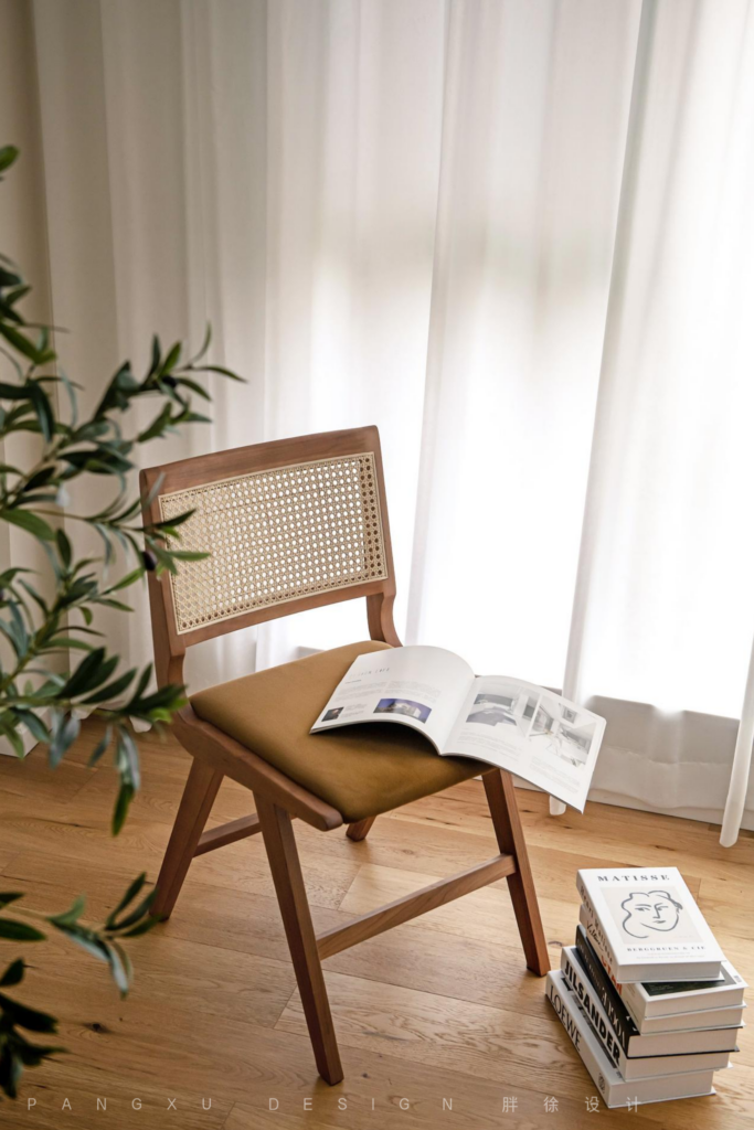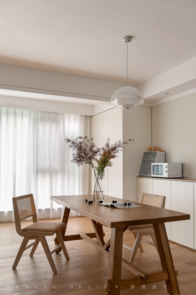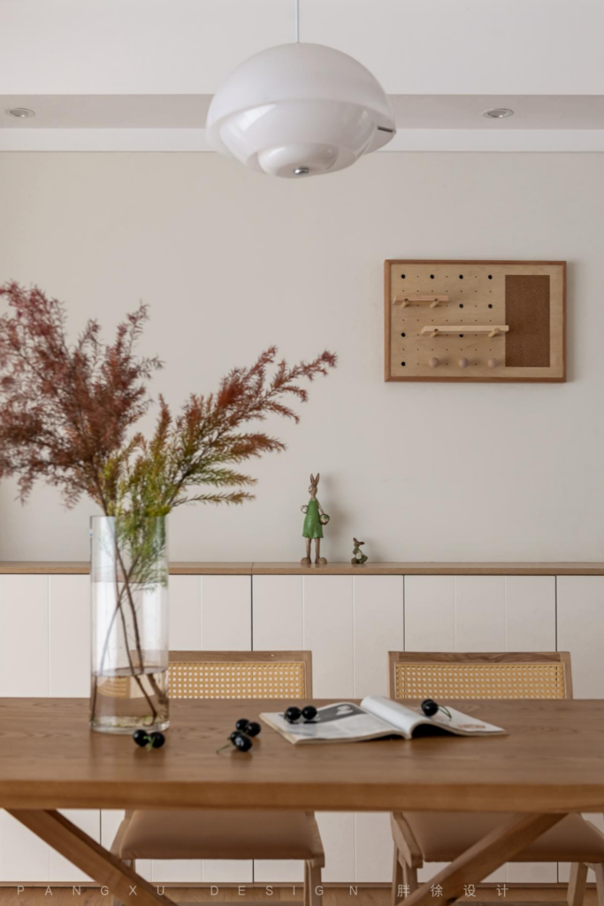 @胖徐设计工作室:同色系的桌椅,让整个客餐厅更和谐统一,藤编的元素给人带来放松惬意之感,再摆上一株同色系的绿植,自然清爽。