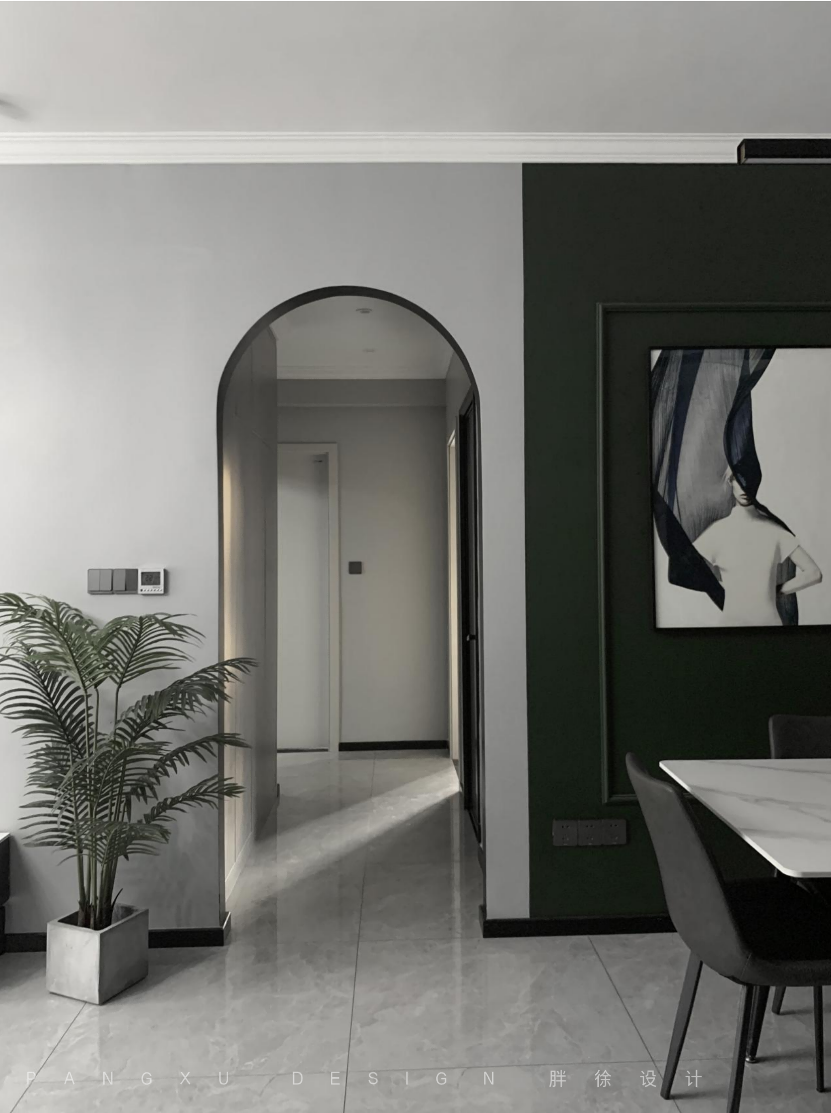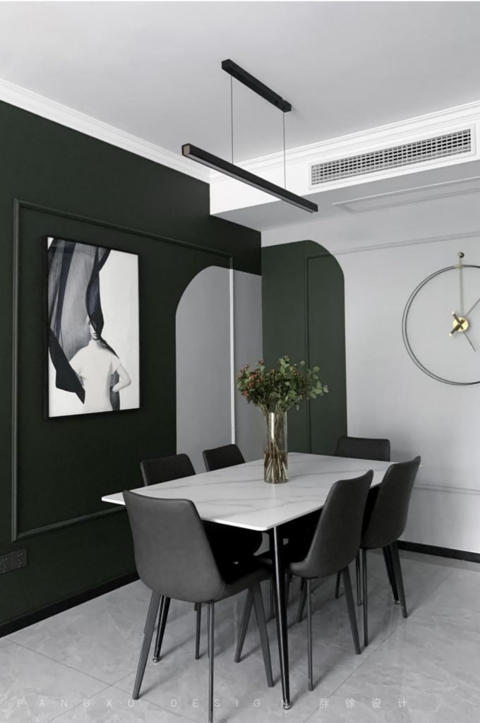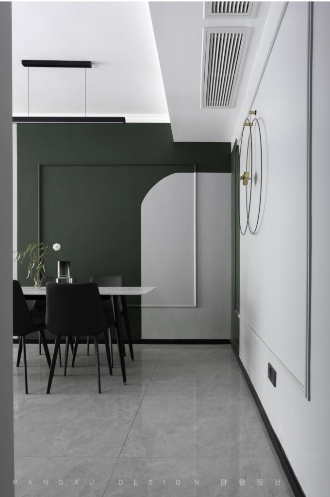 @胖徐设计工作室:沉稳的墨绿是这里的主基调,不规则的图形变化加一点适当的留白,给空间一些设计感的色彩变化,简单的方形线条恰到好处勾勒墙面,在这里享受美食带来的小幸福。