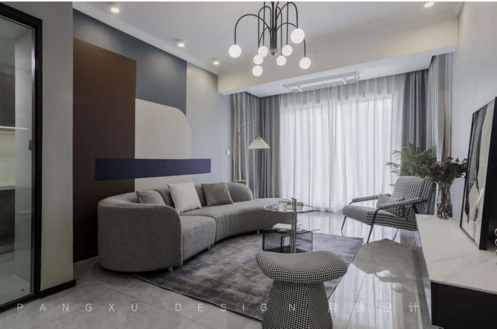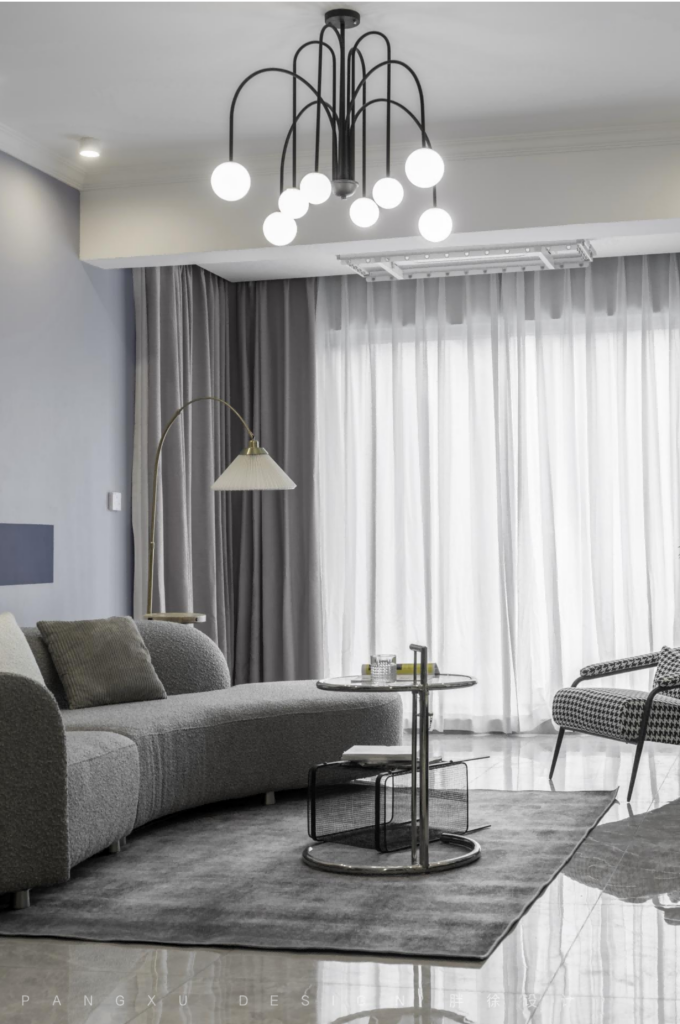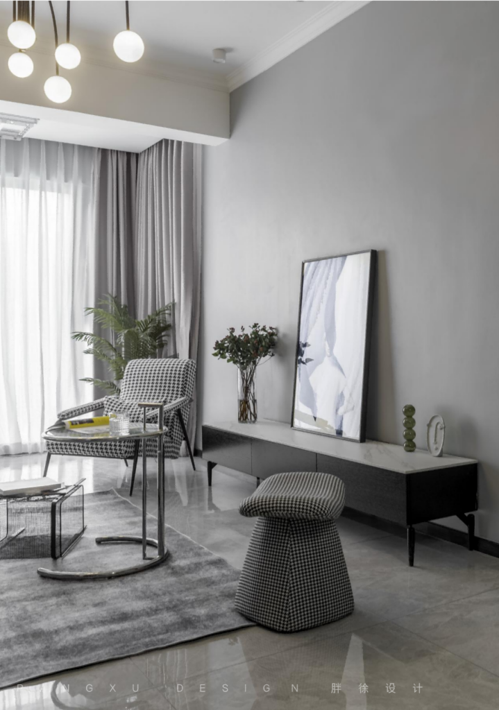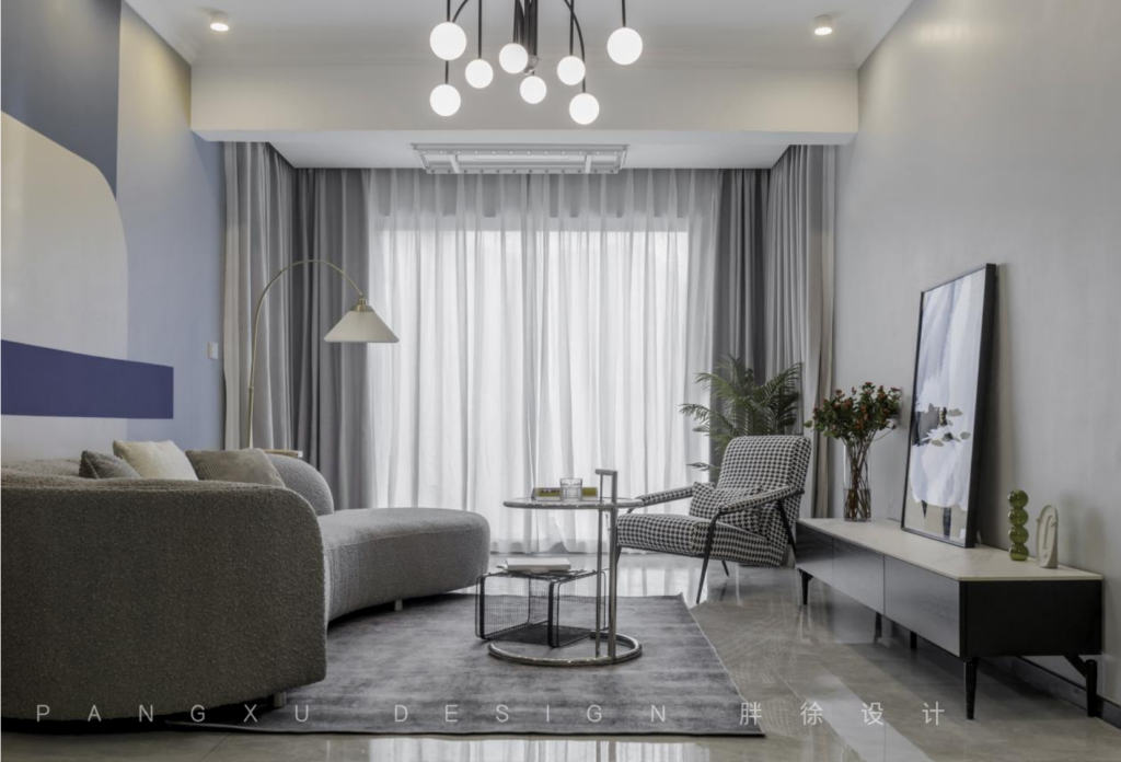 @胖徐设计工作室:与薄纱搭配的落地窗别有一番温柔,简单的小茶几移动方便,在这里带来更大的活动空间,弧形的沙发,柔软舒适,即便是最简单的黑白配,也能陈述不一样的和谐生动。