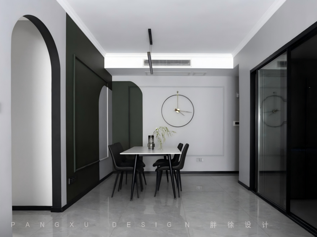 The steady dark green was the main theme here. The irregular pattern change and some proper white marks made the space change in color. The simple square line outlined the wall perfectly, and here she enjoyed the small happiness brought by delicious food.