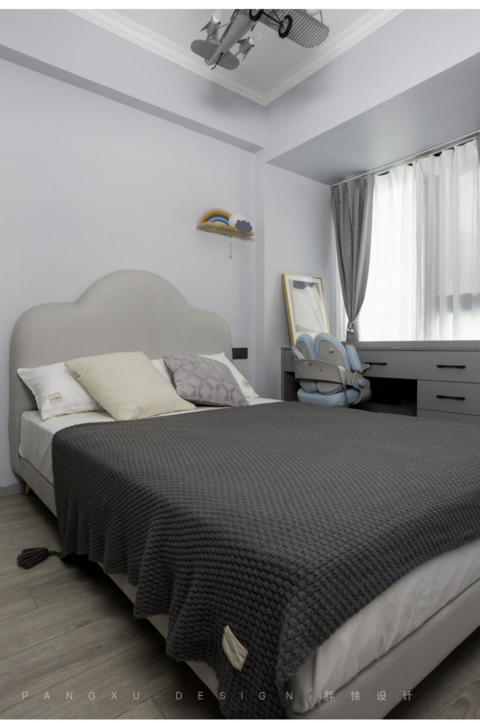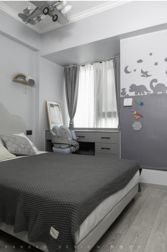 @胖徐设计工作室:需要一点小心思的儿童房,头顶酷酷的飞机模型灯,是童真小小世界里的美丽幻想,带着恐龙元素的小黑板将在小朋友无尽的想象空间里充满不思议的变化。
