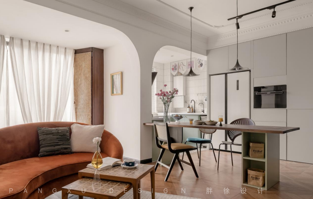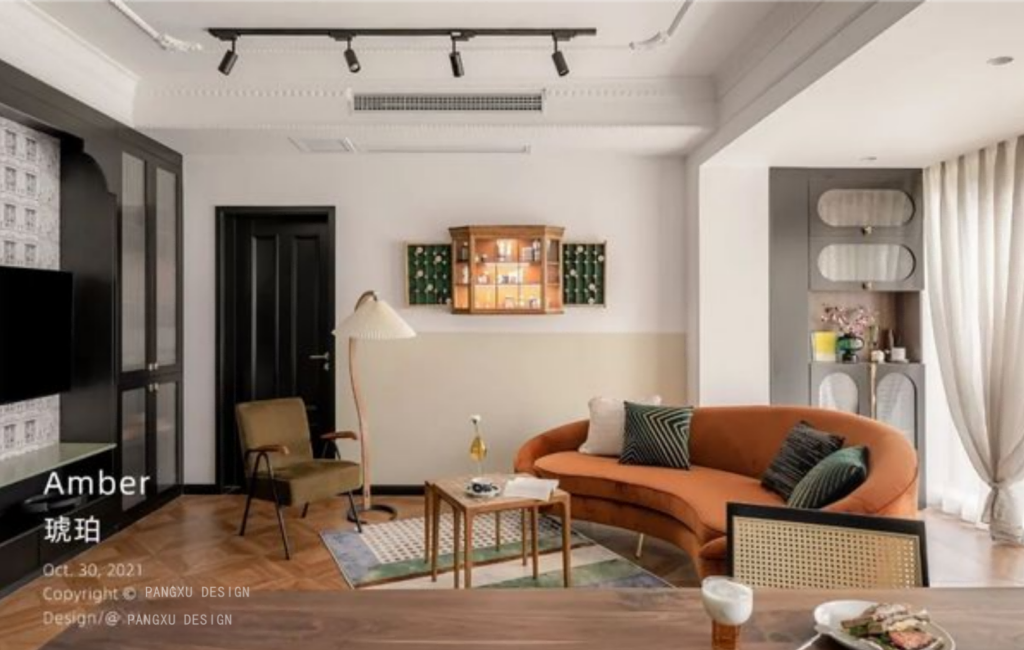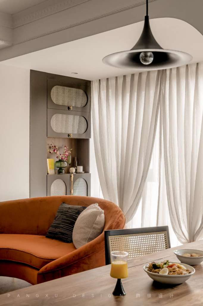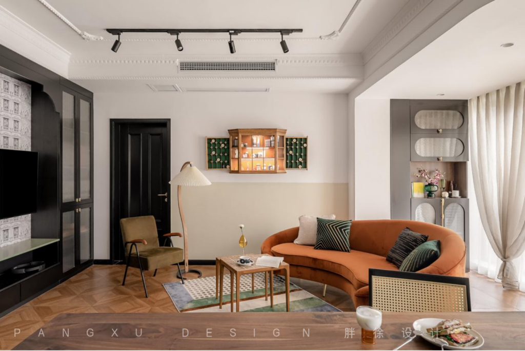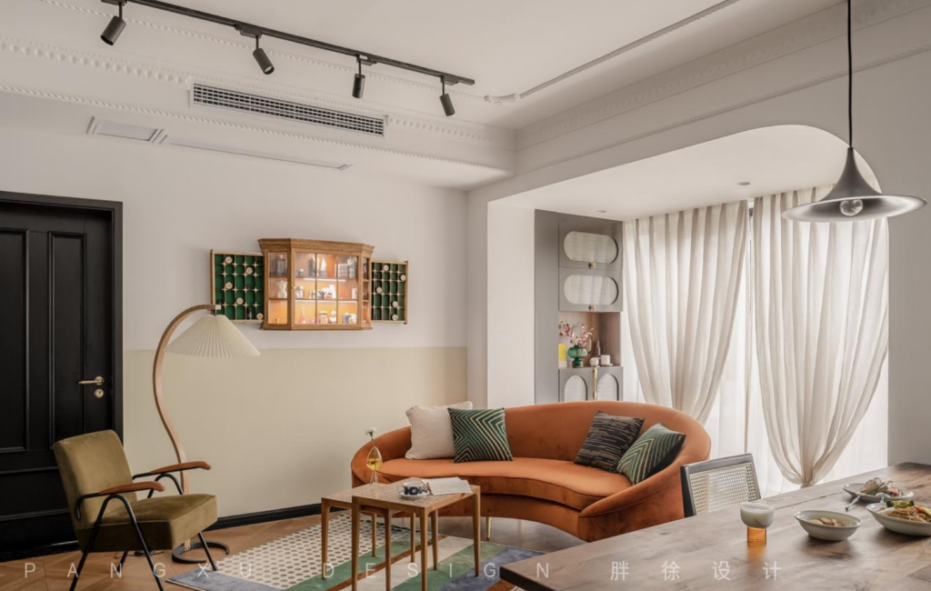 @胖徐设计工作室:暖色带来的温柔,中和于此的复古格调,不再局限于靠墙摆放的沙发,再给空间一点灵动的可能,弧形的曲线,是更温和的柔软。