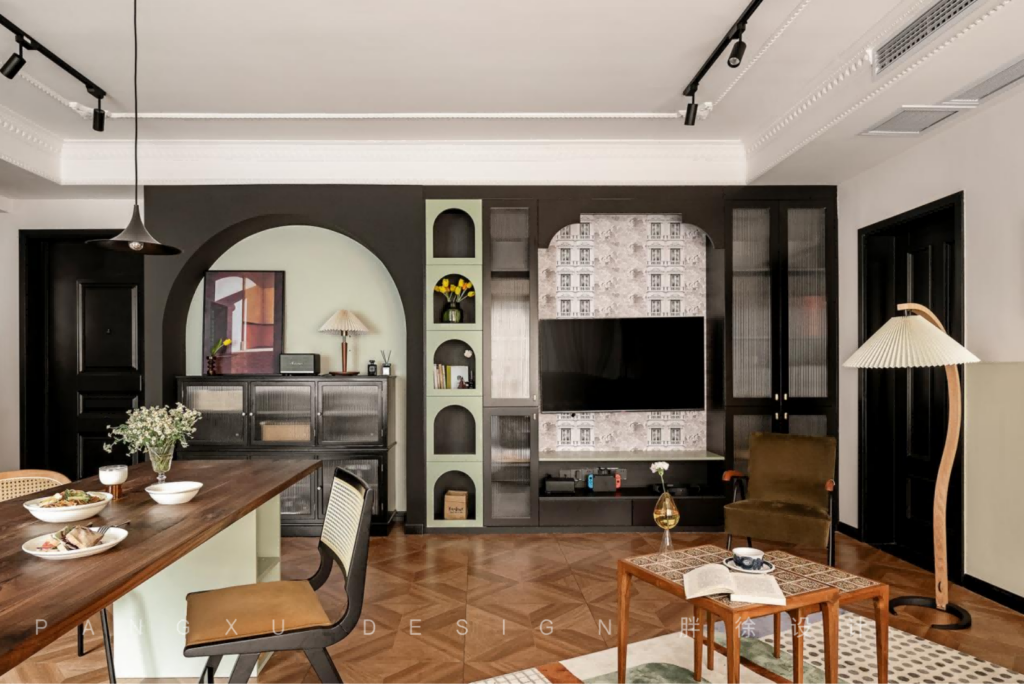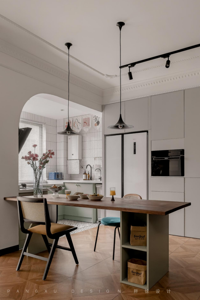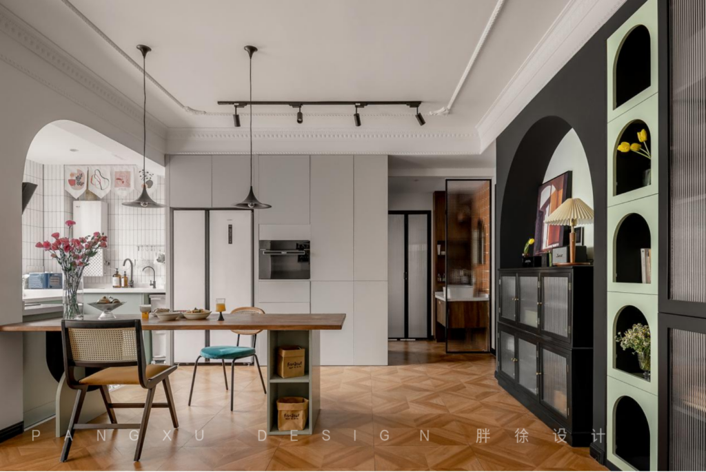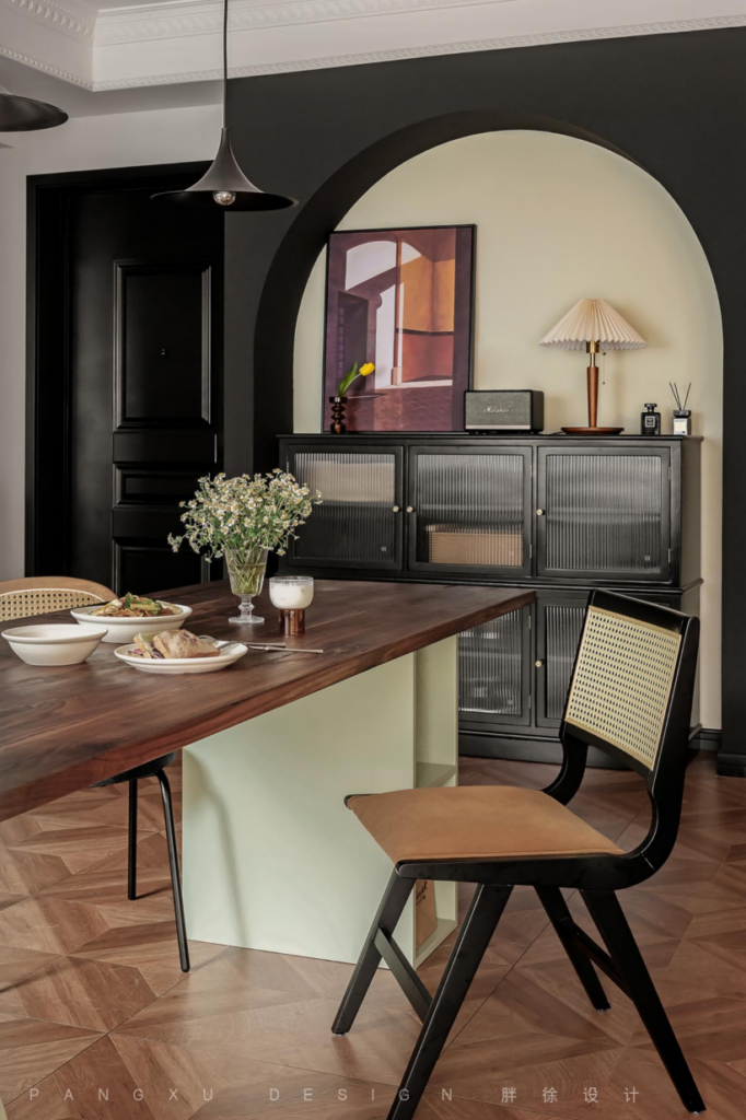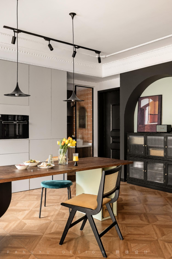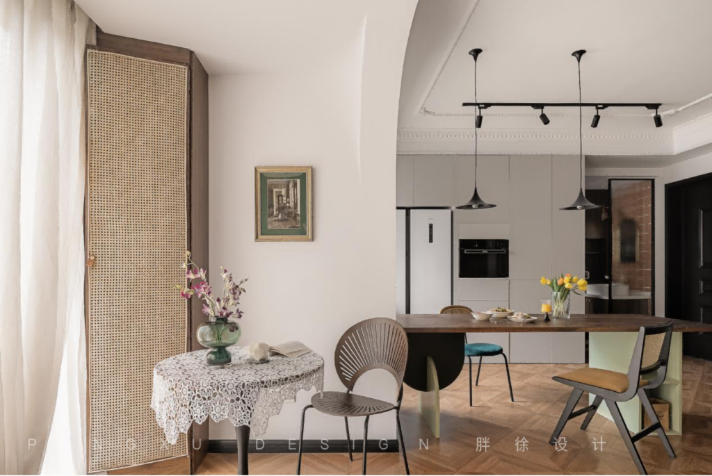 @胖徐设计工作室:餐厅加一些弧形设计的垭口,让整个空间更流畅开阔。复古的吊灯下,原木的长桌上,是三餐四时,最简单纯粹的生活状态。