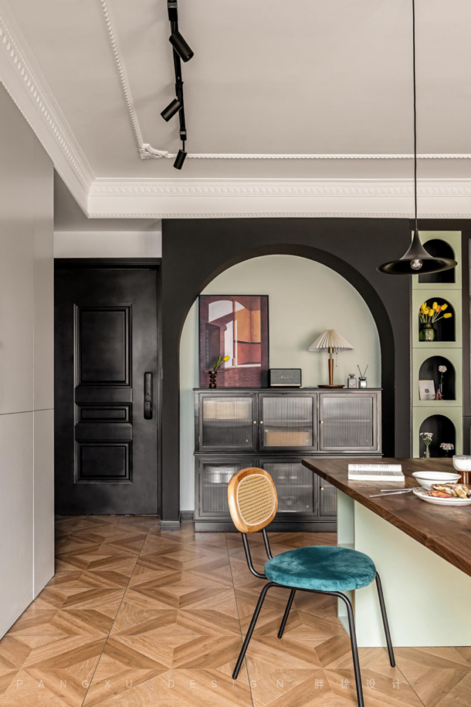 @胖徐设计工作室:复古花纹的墙纸,加一点石膏线条装饰的精致,在此处填满中古的格调,让治愈系奶绿柔和了深黑色的沉闷。