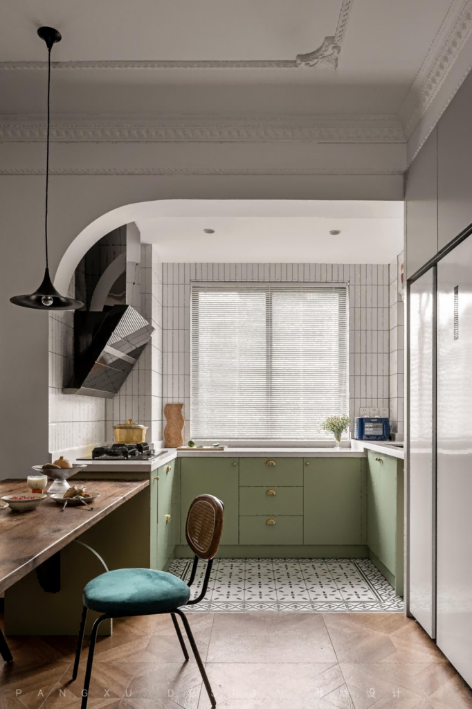 @胖徐设计工作室:开放式的厨房搭配奶绿的橱柜,阳光透过百叶铺洒在复古小花砖上,U形布局能带来更舒适宽敞的操作空间。