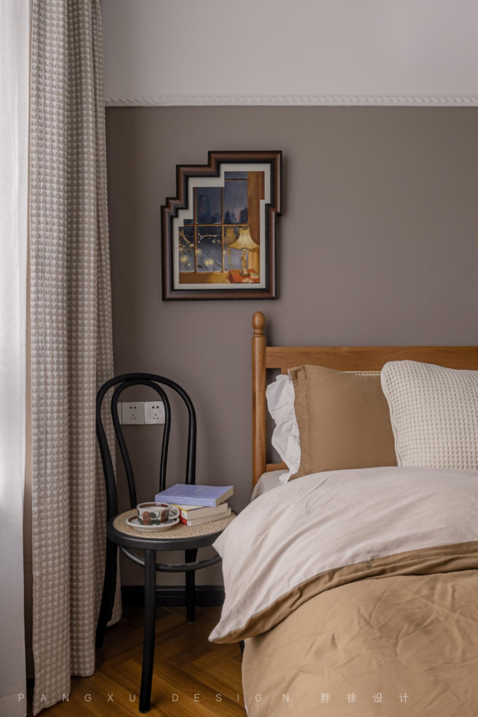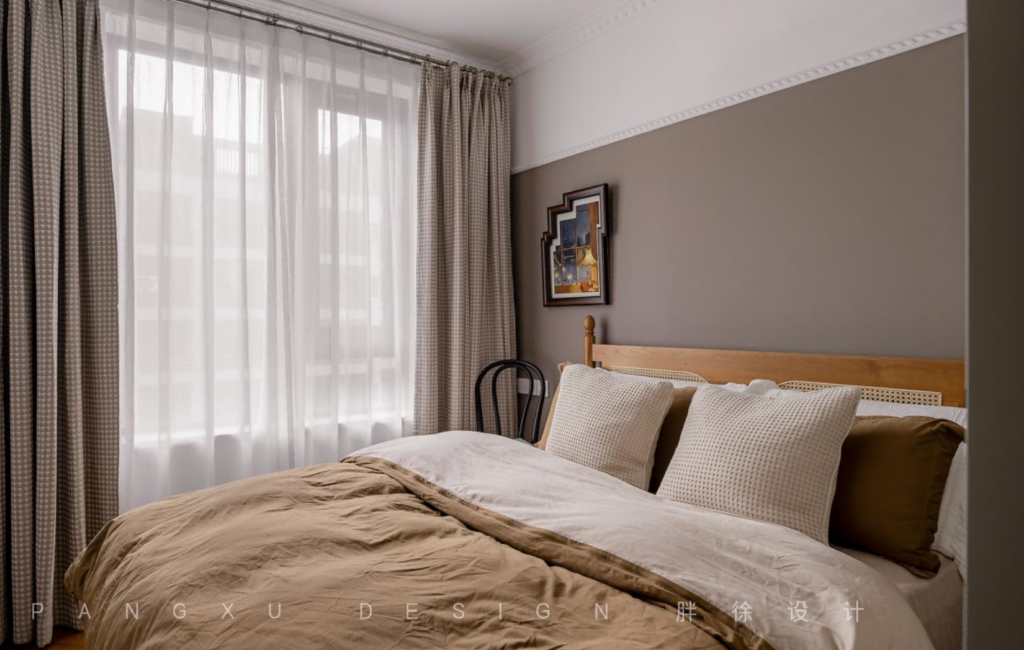 @胖徐设计工作室:同色系的搭配让次卧更和谐温柔,暖棕色带来的氛围感是柔软放松的,也缓和了此处深色系内敛的冰冷。