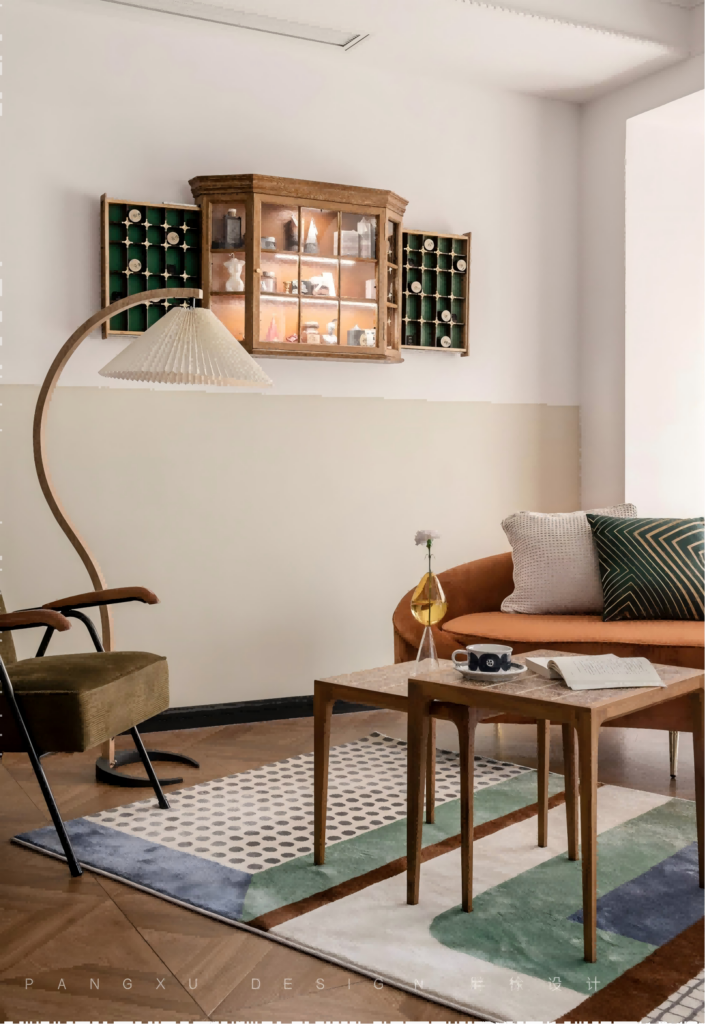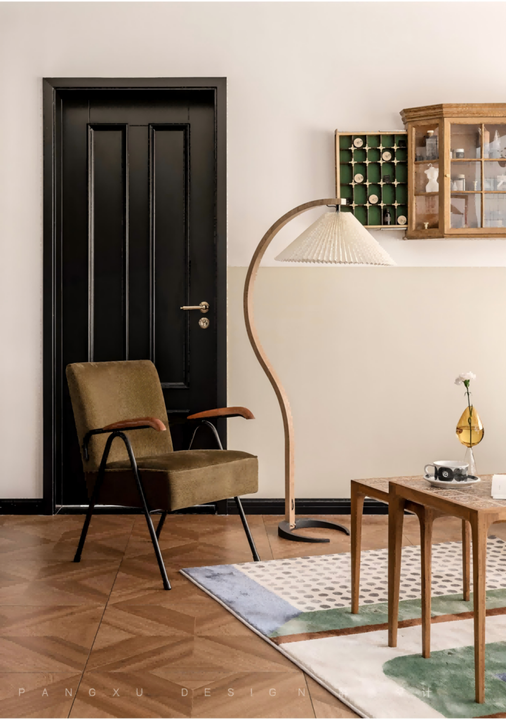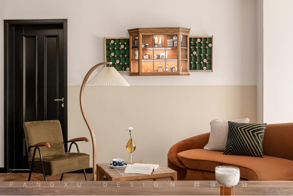 @胖徐设计工作室:典雅的复古绿,搭配木质的小茶几。复古的壁柜珍藏着生活里的仪式与浪漫,交汇于百褶落地灯的温柔。