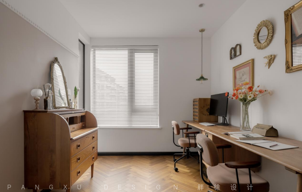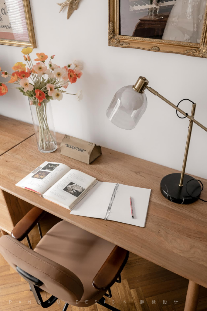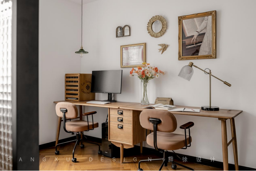 @胖徐设计工作室:书房处留下足够的两人空间,一起办公,一起学习,也是一种乐趣。于此,复古黑边的长虹玻璃带来刚好的朦胧通透感,既不沉闷也不跳脱。