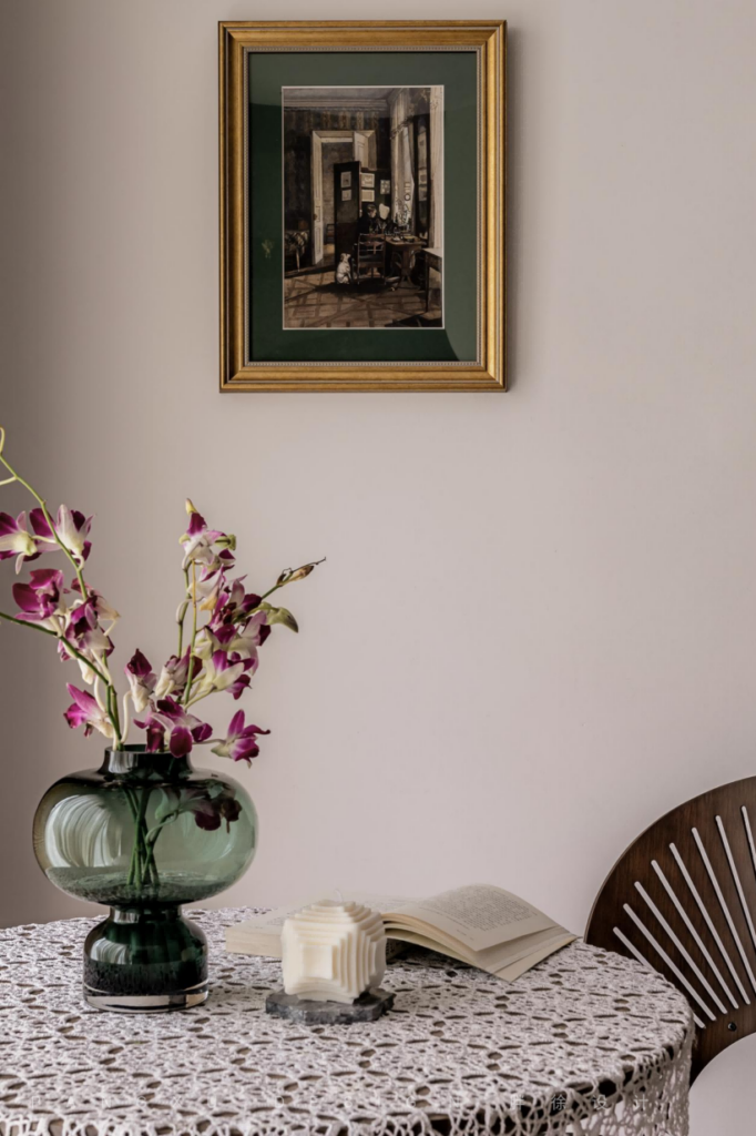 Vintage wallpaper, plus a little exquisite gypsum line decoration, fill the medieval style here, and soften the dull dark black with cream green.