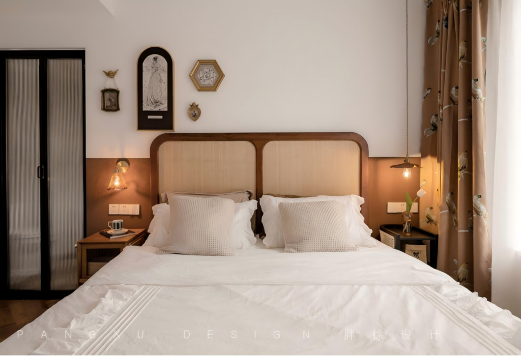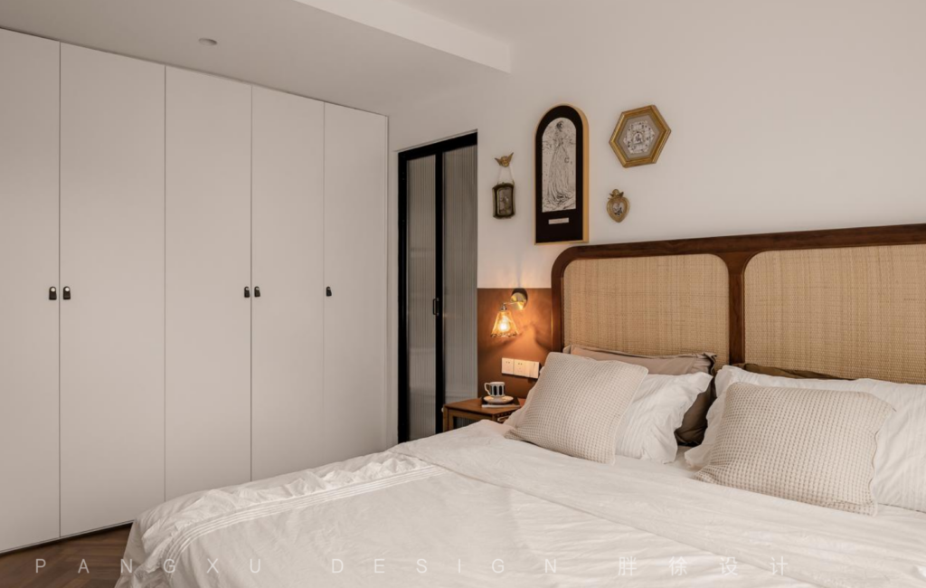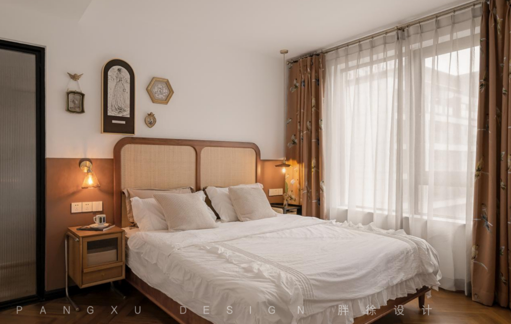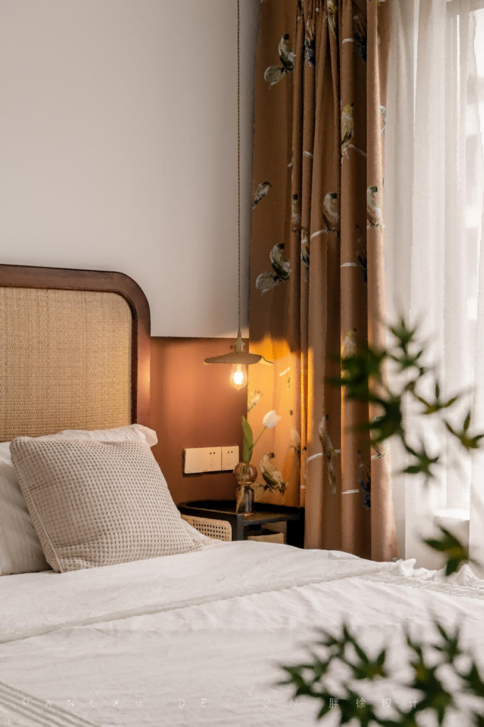 @胖徐设计工作室:复古铜金色勾勒点缀的挂饰,加上藤编的质朴自然,让简约与复古都于此融合得刚好,而暖色是温馨感在此最温柔的表达。