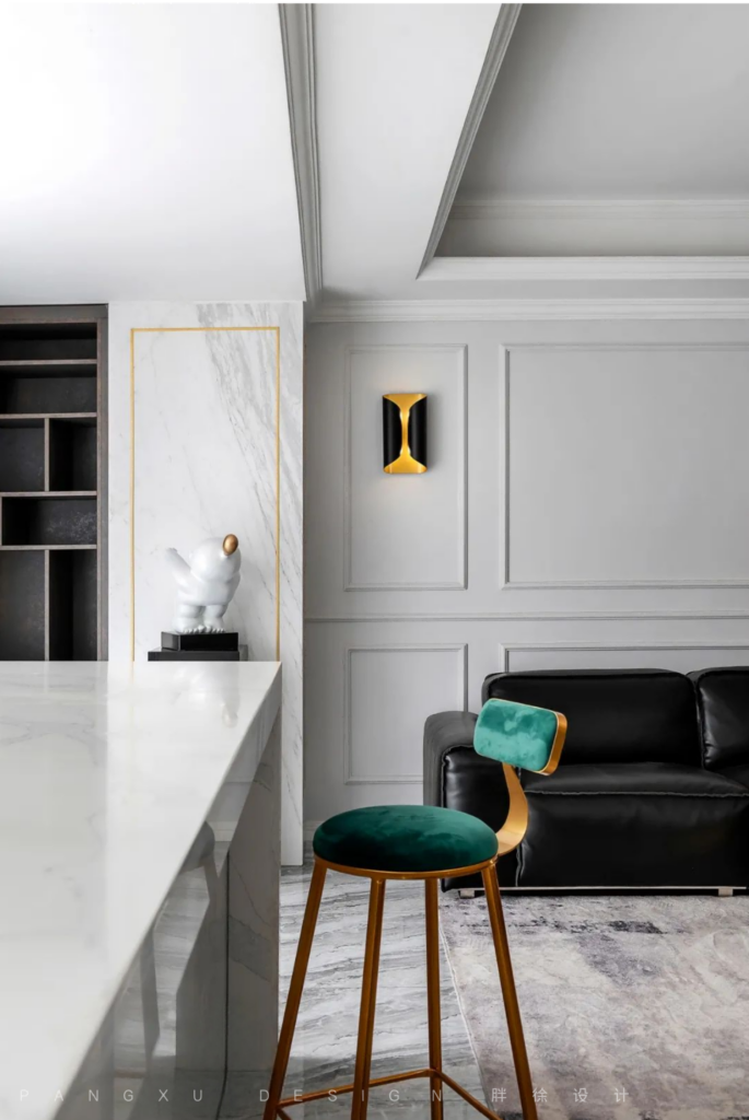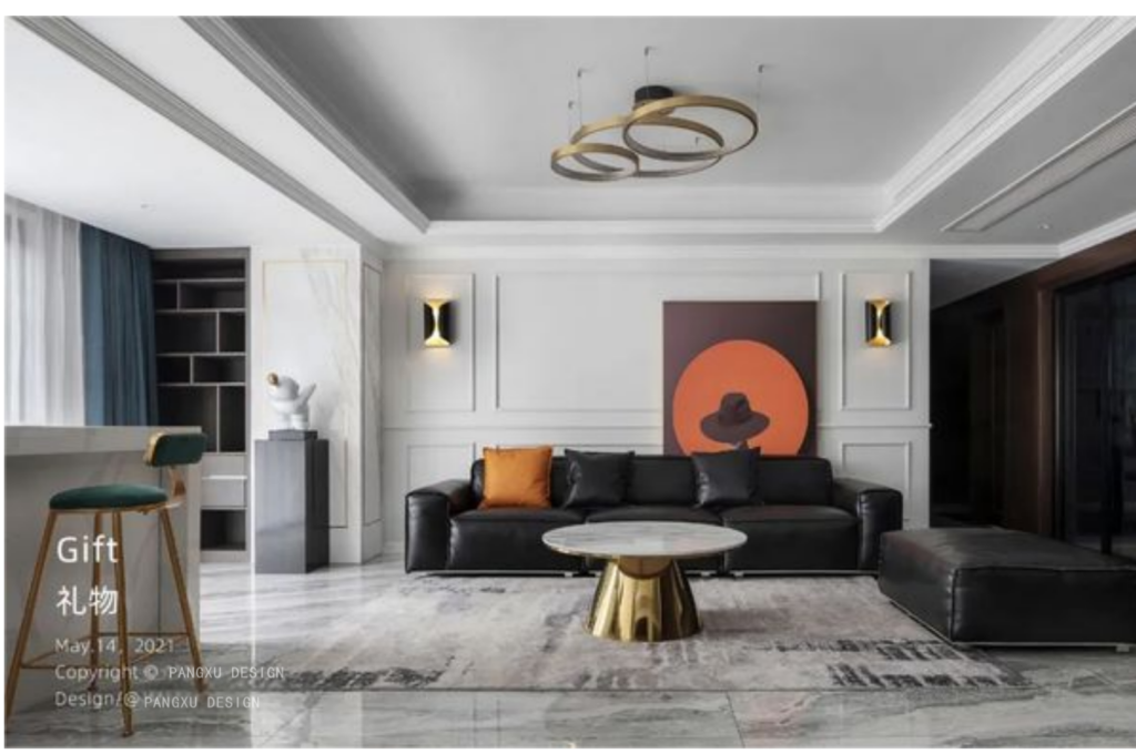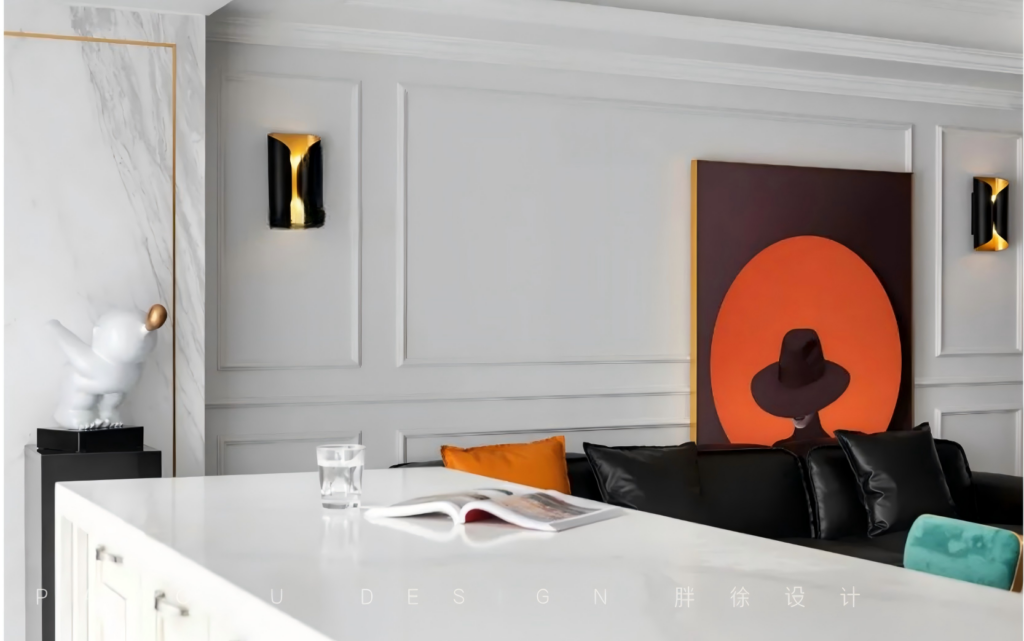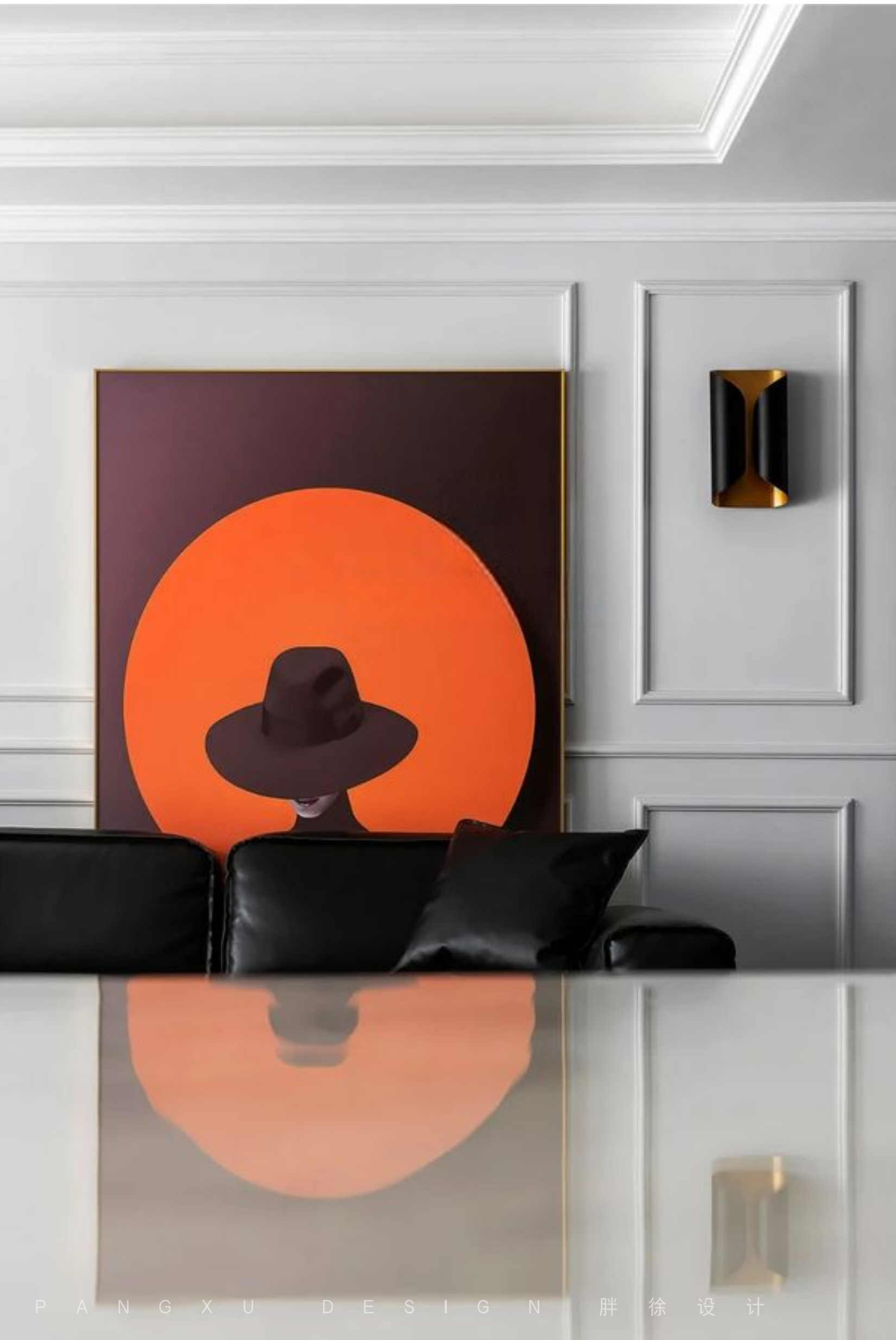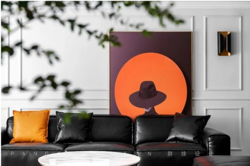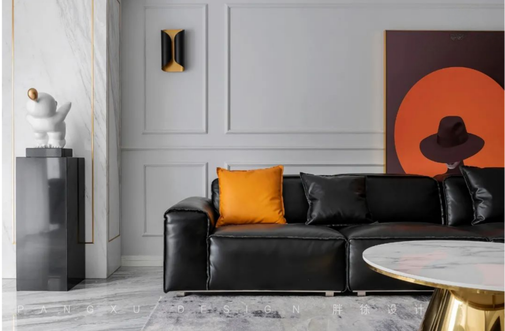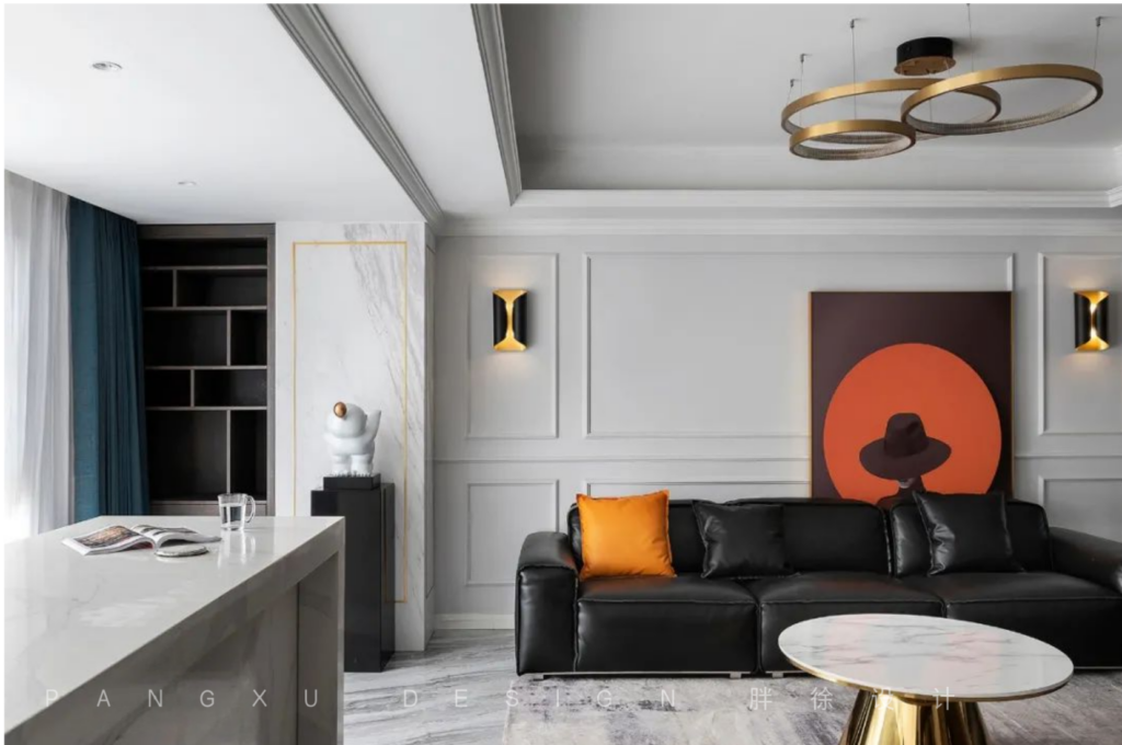 @胖徐设计工作室:纯黑皮质沙发,石膏线勾勒的墙面,是属于现代美式的浪漫优雅。往后这里会留下生活的身影,记录他们的专属故事。