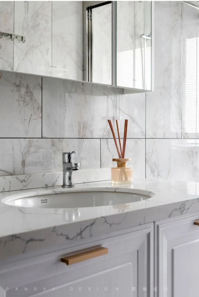 @胖徐设计工作室:大理石台面质感优雅,镜面浴室柜,也让整个空间更开阔明亮。