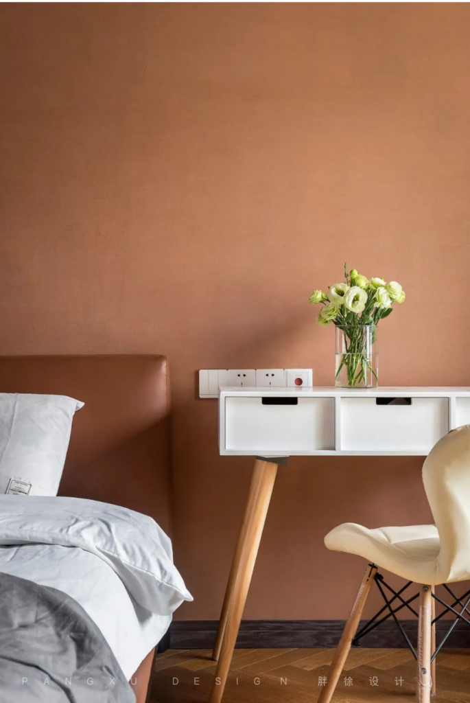 @胖徐设计工作室:单一的墙面需要亮眼的色彩打破,橘色调点缀得恰好,不跳脱也不突兀。