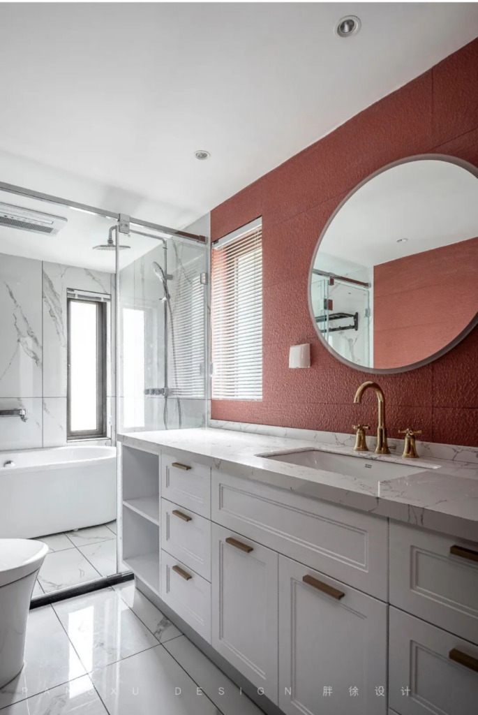 @胖徐设计工作室:主卫墙面纹理质感,红色突破单一不变的寡淡色调。干湿分离,更方便清洁打扫。玻璃隔断、百叶,都是增加空间通透感的美丽元素。